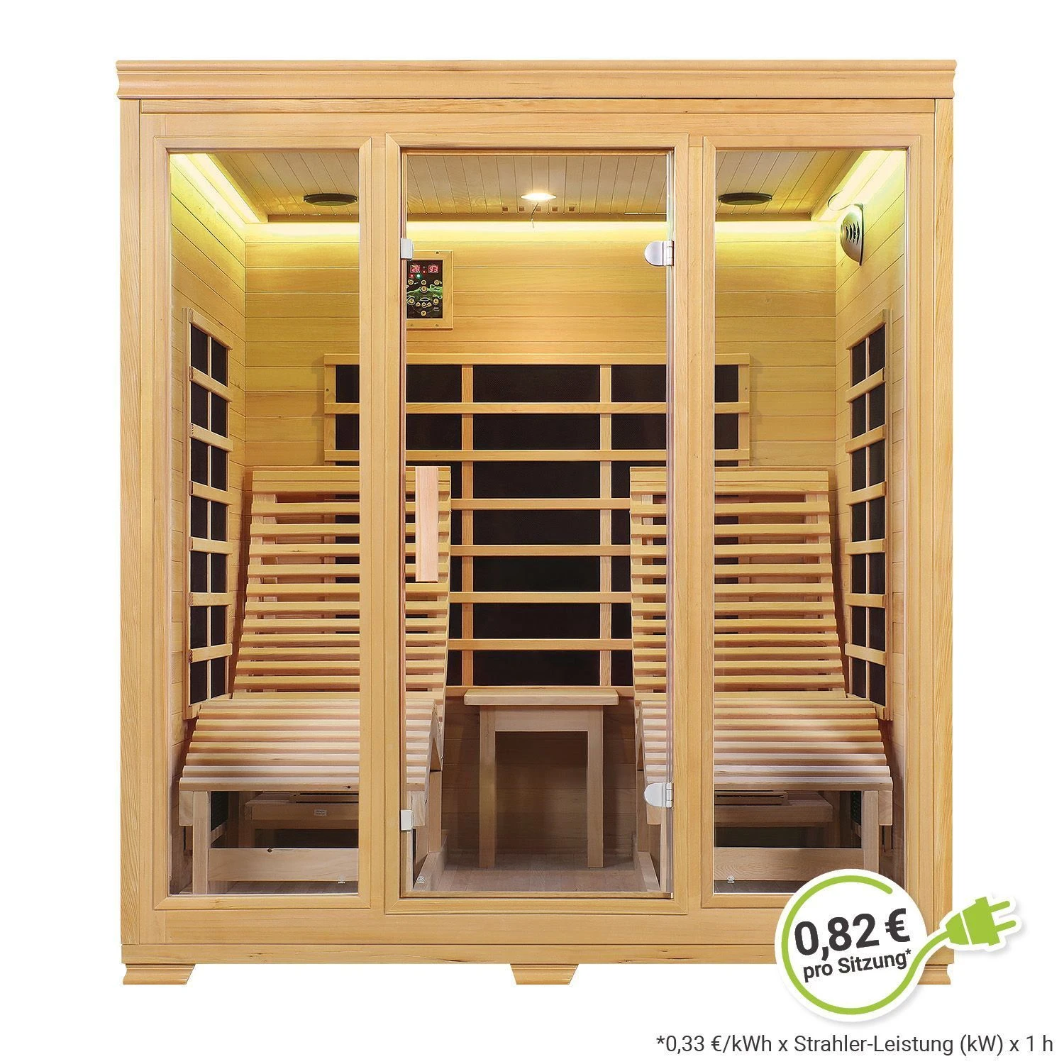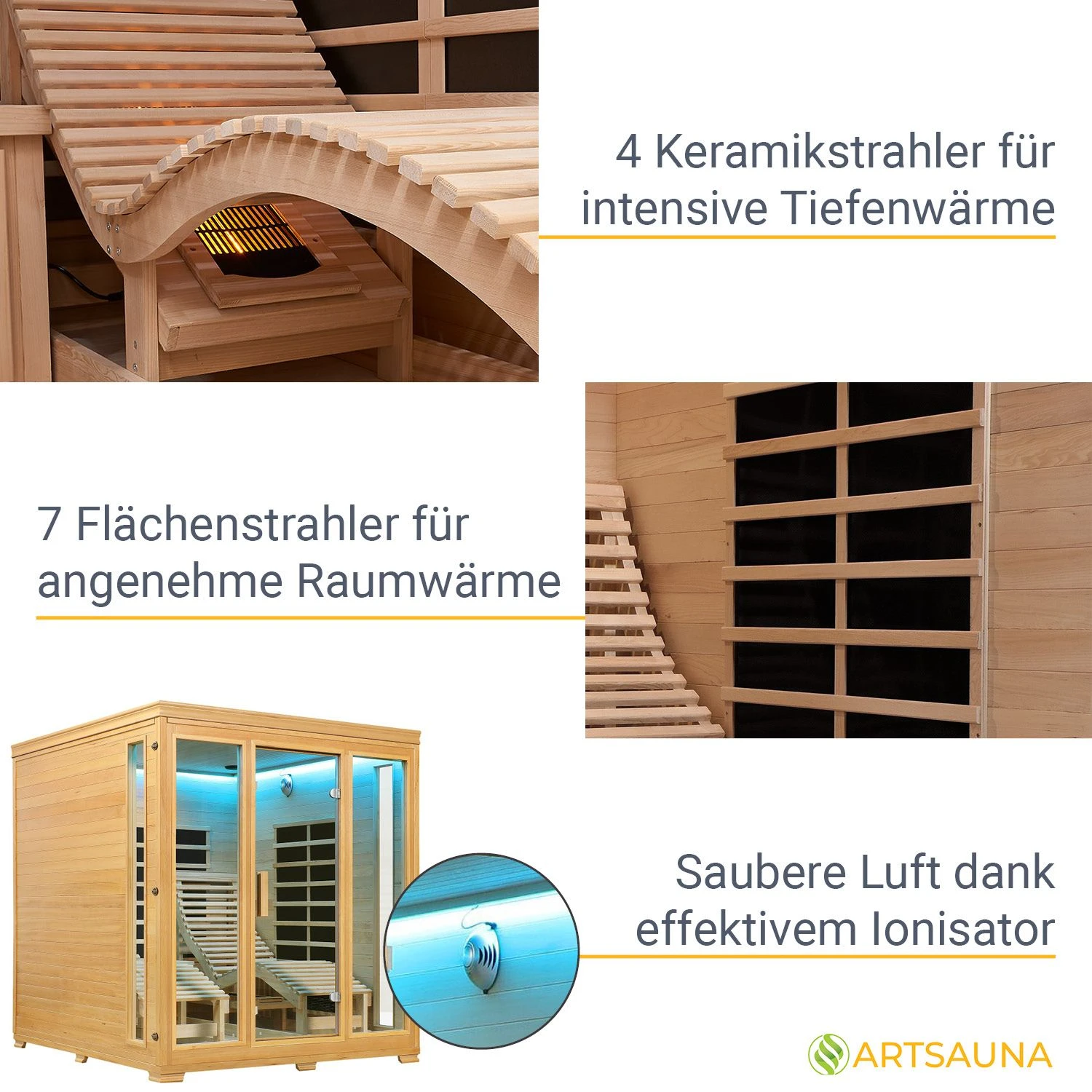 Die insgesamt vier Keramikstrahler sorgen für eine intensive Hitze, die tief in Ihren Körper eindringt. So können sich Verspannungen im Rücken- und Wadenbereich besonders gut lösen. Sieben weitere Flächenstrahler verteilen eine milde Wärme innerhalb der gesamten Kabine.