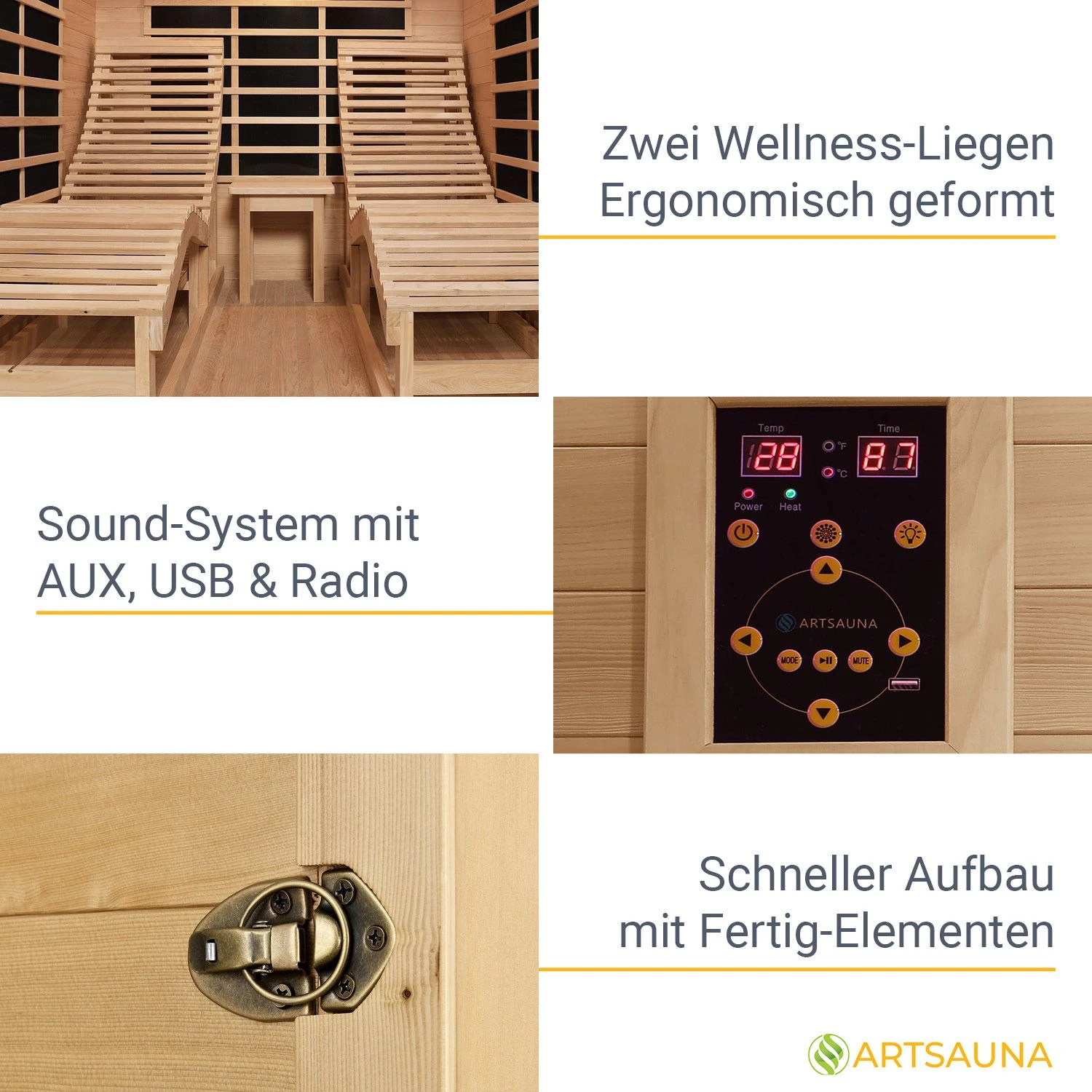 Auf den beiden großen komfortablen Liegen finden 2 Personen bequem Platz. Mit einem Stellmaß von 170 x 190 cm bleibt die Infrarotkabine eine platzsparende Angelegenheit. Schaffen auch Sie sich Ihre eigene kleine Wellness-Oase für Zuhause.