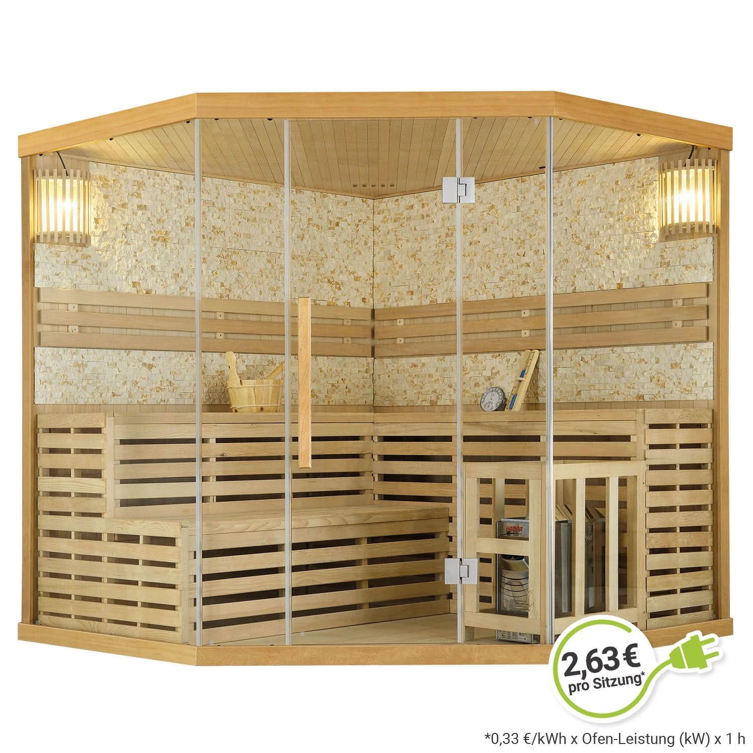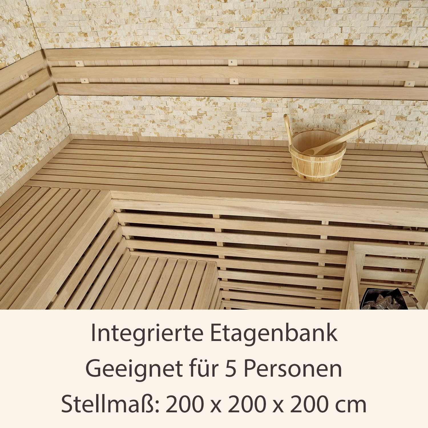 Die große integrierte Etagenbank aus Holz bietet einen bequemen Sitzplatz für bis zu fünf Personen. Mit einem Stellmaß von 200 x 200 x 200 cm bleibt die Ecksauna eine platzsparende Angelegenheit. Schaffen auch Sie sich Ihre eigene kleine Wellness-Oase für Zuhause.