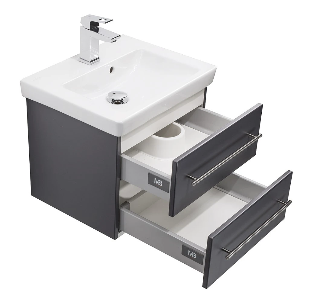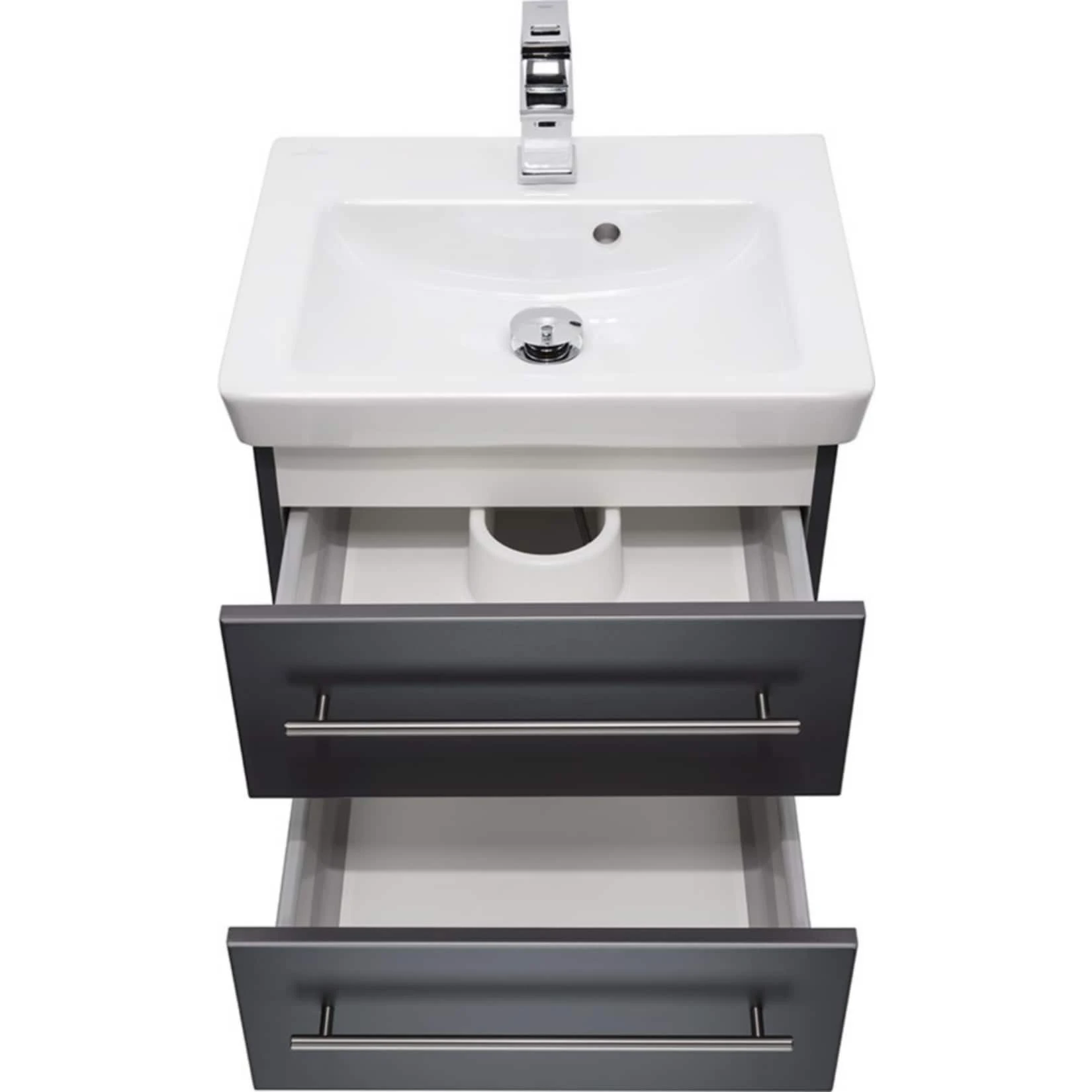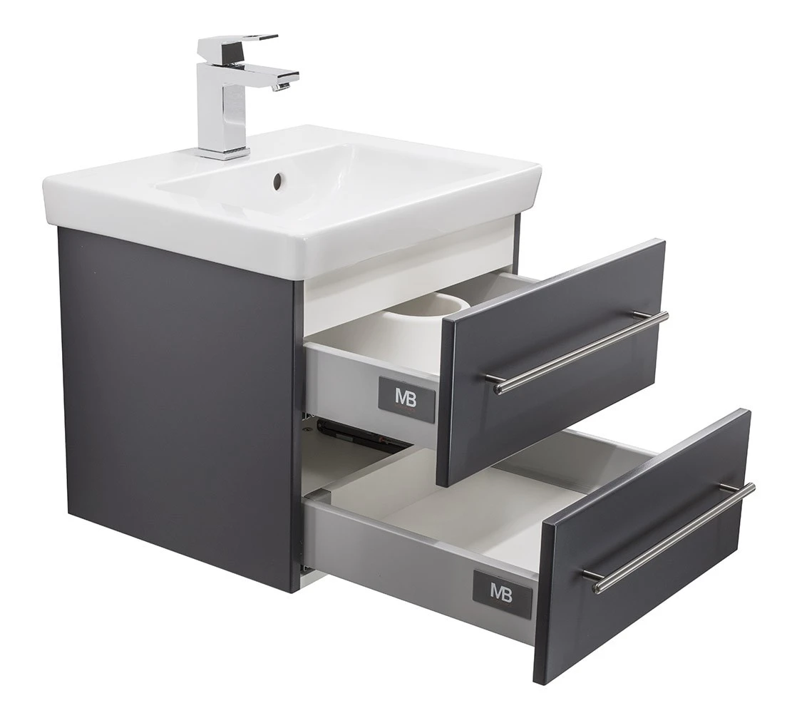 Der Waschtisch besitzt einen Unterschrank in edlem Anthrazit Seidenglanz, der über 2 Softclose Schubladen verfügt. Die 2 Softclose Schubladen garantieren einen reibungslosen Auszug und Sie finden Ihren gewünschten Badartikel schnell und unkompliziert. Der Unterschrank bietet Ihnen ausreichend Platz, um alle Ihre Badutensilien unterzubringen. Die Oberfläche wird durch zwei Edelstahl-Griffe auf dezente Weise belebt. Dank der zusätzlichen Markenbeschichtung ist der Schrank problemlos zu reinigen. Sie benötigen nur ein feuchtes Tuch, um Staub und Schmutz zu entfernen.