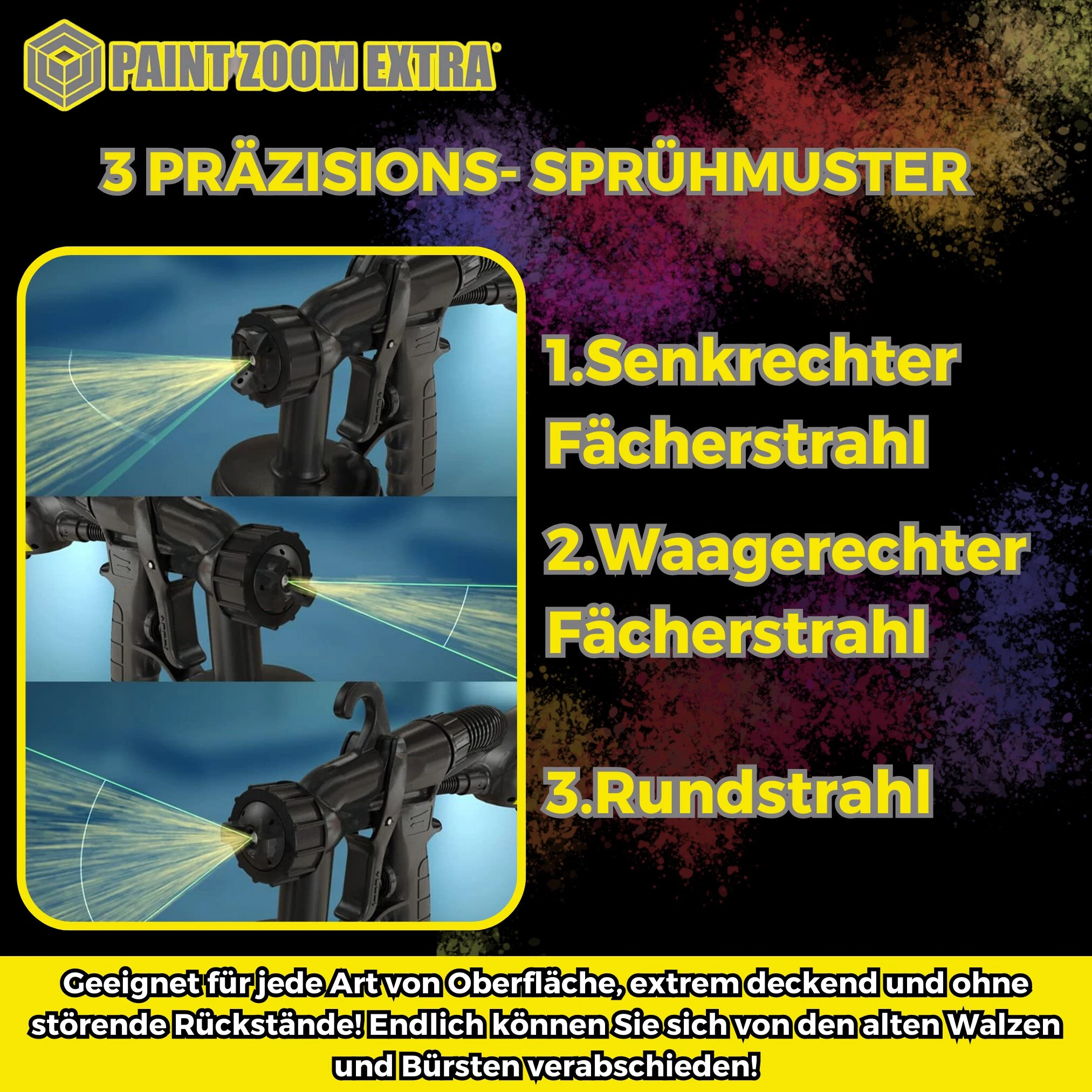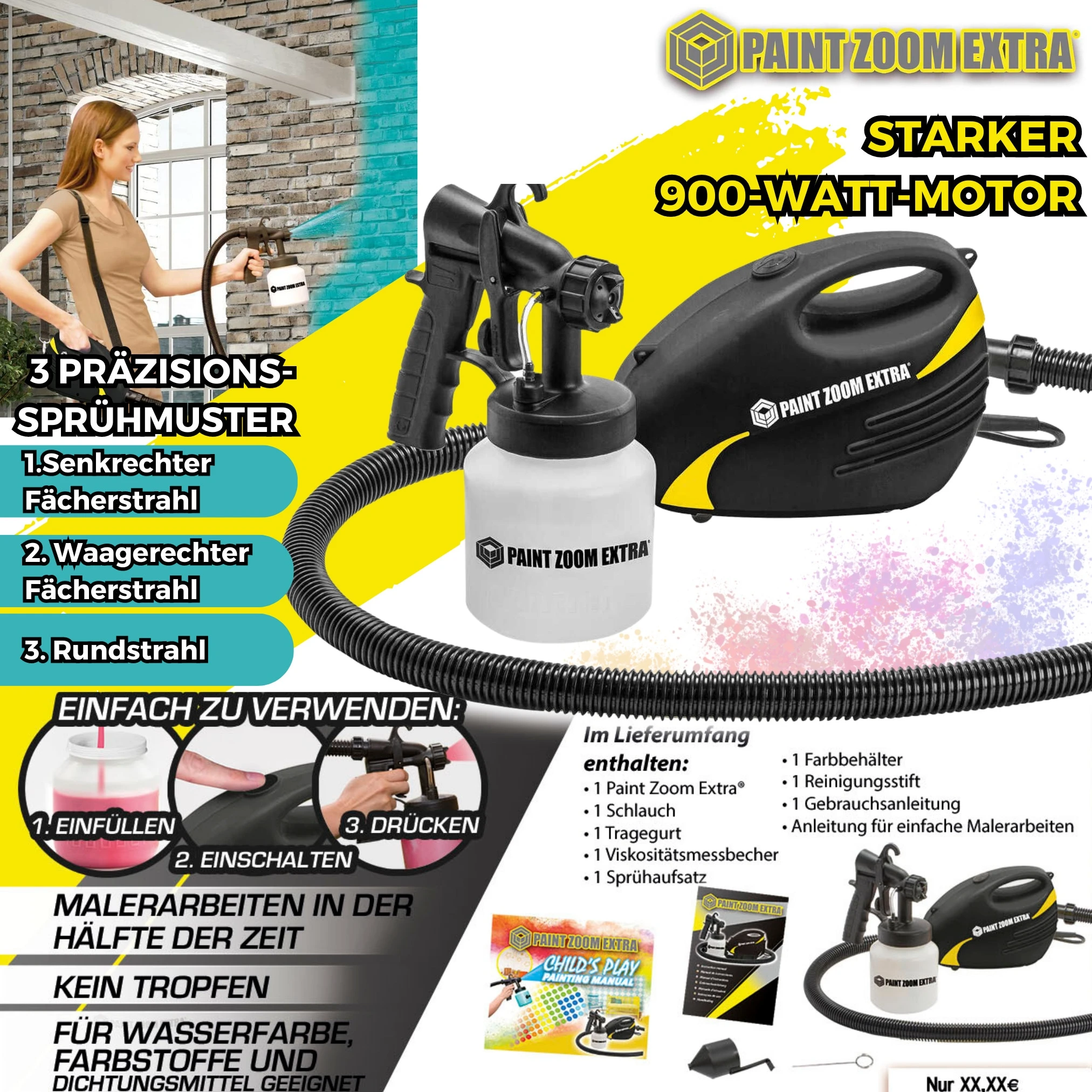 Paint Zoom Extra® – Neues professionelles Power Farbsprühsystem mit besonders leistungsstarker 900 Watt Motor! Neuartiges Spritzsystem für Farben, Färbemittel und Abdichtmittel. Genaue Regulierung der Farbmenge für eine Farbersparnis. Einstellung des Farbstrahls für präzises Aufbringen der Farbe für einen gleichmäßigen Anstrich.