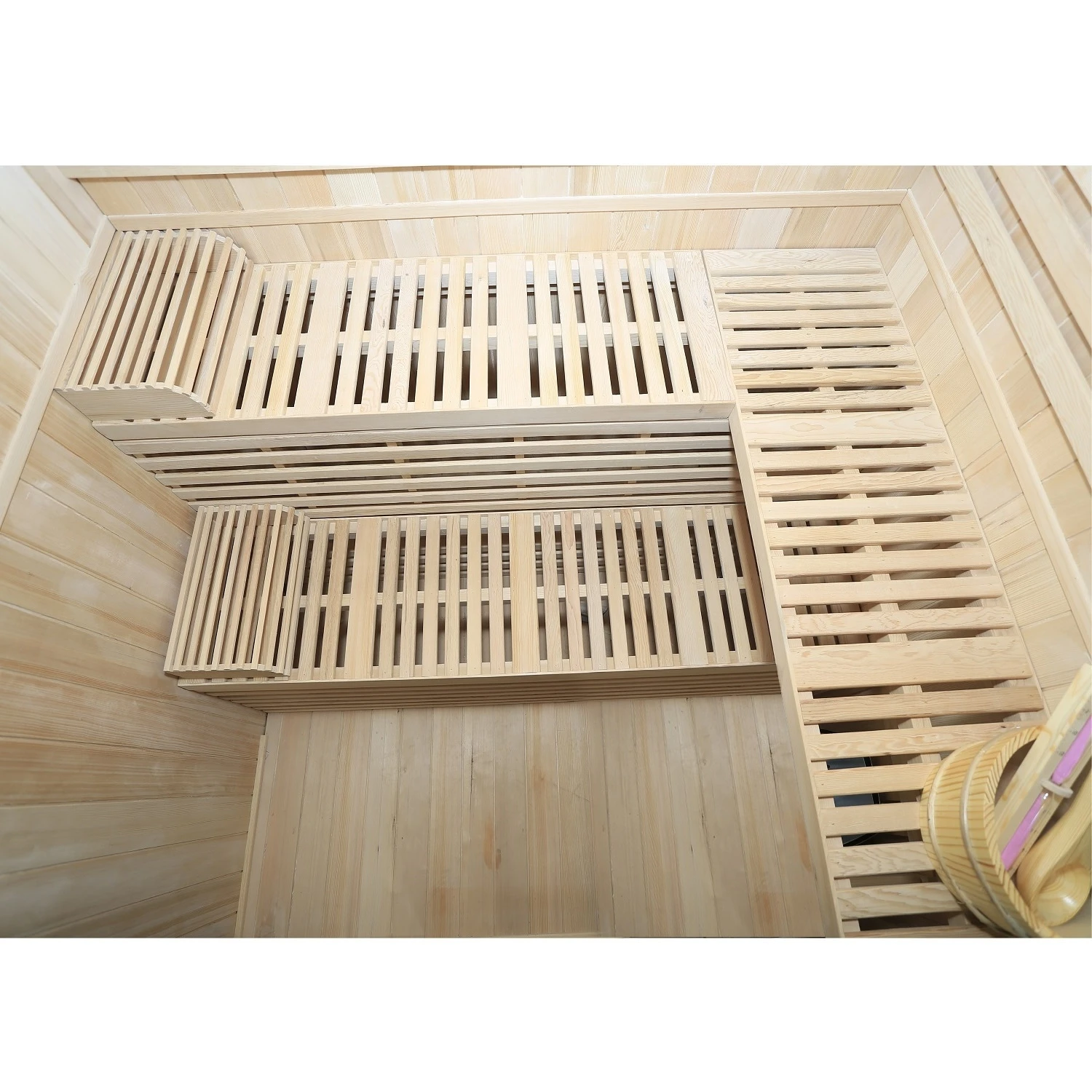 Die Dewello Sauna “SARNIA” für die ganze Familie! Hergestellt aus hochwertigem Hemlock Tannenholz.