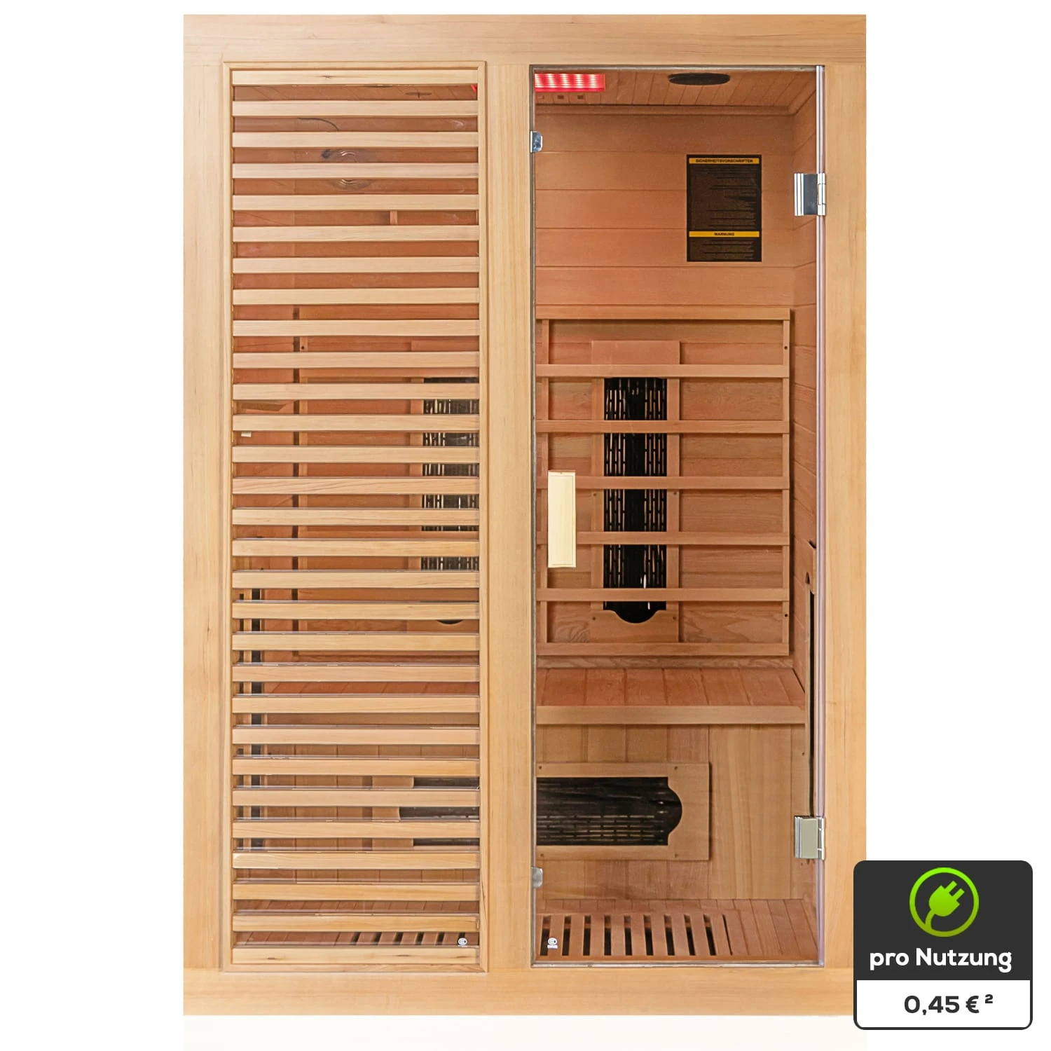 Die Kosten pro Saunagang bei dieser Infrarotkabine liegen bei etwa 0,45 € Die Berechnung basiert auf einem Preis von 0,50€ pro kWh. Es wird von einer effektiven Nutzung von 20 Minuten ausgegangen. Bei Infrarotkabinen mit Keramikstrahlern geht man zuvor vor von einer Aufheizzeit von 10 Minuten aus.