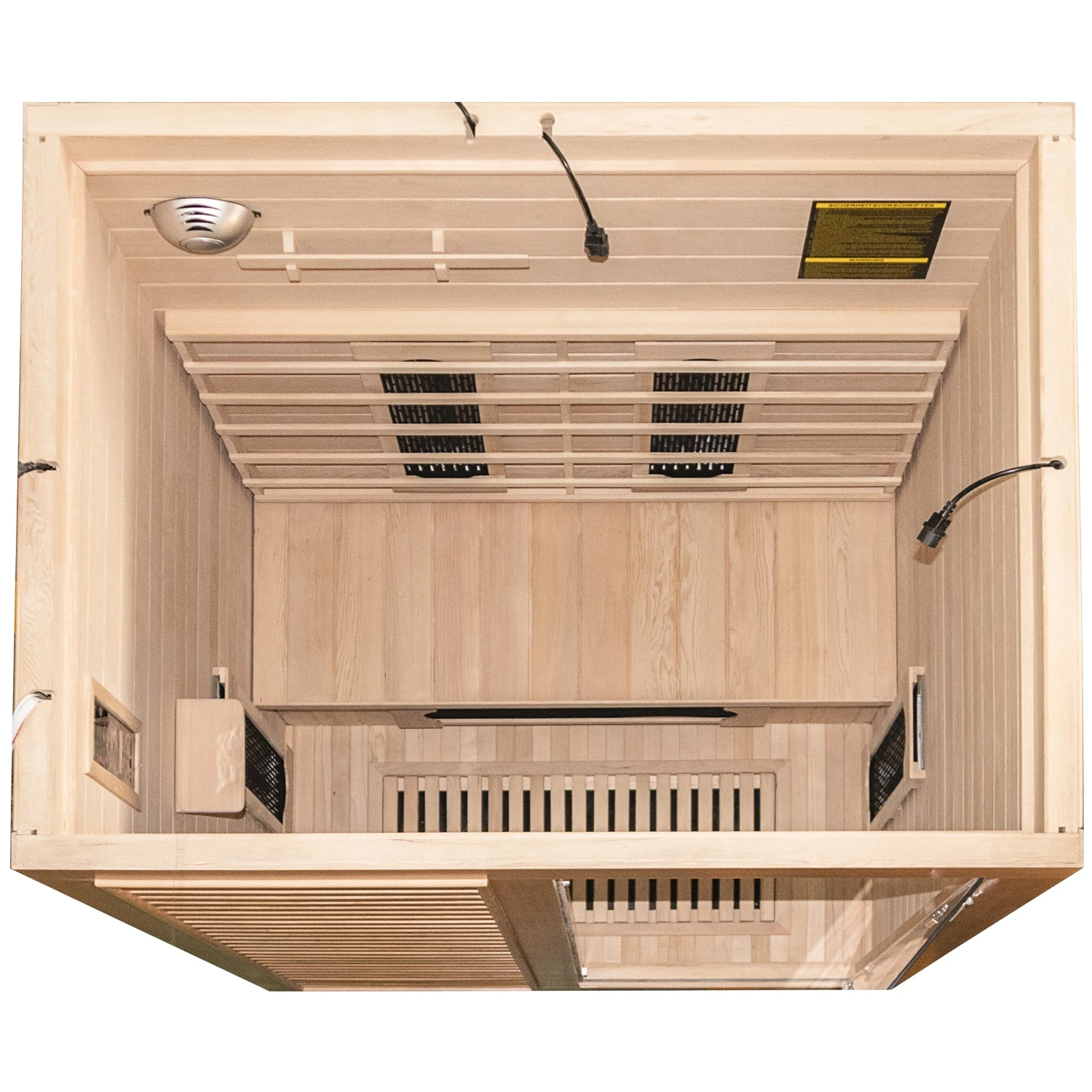 Dieser strahlt zusätzlich von unten, sodass Sie auch im unteren Bereich der Kabine (Fußbereich) Wärme verspüren. Da Sie Ihre Füße direkt über den Strahler platzieren, wurde hier ein gleichmäßig wärmender Karbon- Flächenstrahler verbaut.