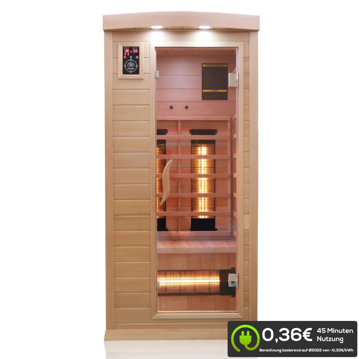 Trotz steigernder Energiekosten, haben Sie bei einer Dewello Infrarotkabinen nur geringe Stromkosten. Die PIERSON für eine Person (90cm x 90cm) verbraucht bei einem Saunagang (30 Minuten) nur etwa 0,7 Kwh. Somit liegen Sie hier nur bei etwa 35 Cent Stromkosten (bei 0,5€ pro Kwh). Die 2 Personen (135cm x 105cm) Variante kommt bei gleicher Nutzung auf etwa 53 Cent Stromkosten, während man bei dem 3 Personen Modell (160cm x 105cm) mit etwa 60 Cent pro Saunagang rechnen muss. Dank der vielen Strahler und vor allem der hochwertigen Vollspektrumstrahler haben Sie quasi keine Aufheizzeit und sparen zusätzlich an Energie. Dewello Infrarotkabinen sind im Vergleich zu herkömmlichen Saunen daher sehr energiesparend und bieten bei den derzeit stark steigenden Energiepreisen einen optimalen Kompromiss zwischen Wellness und Unterhaltkosten.