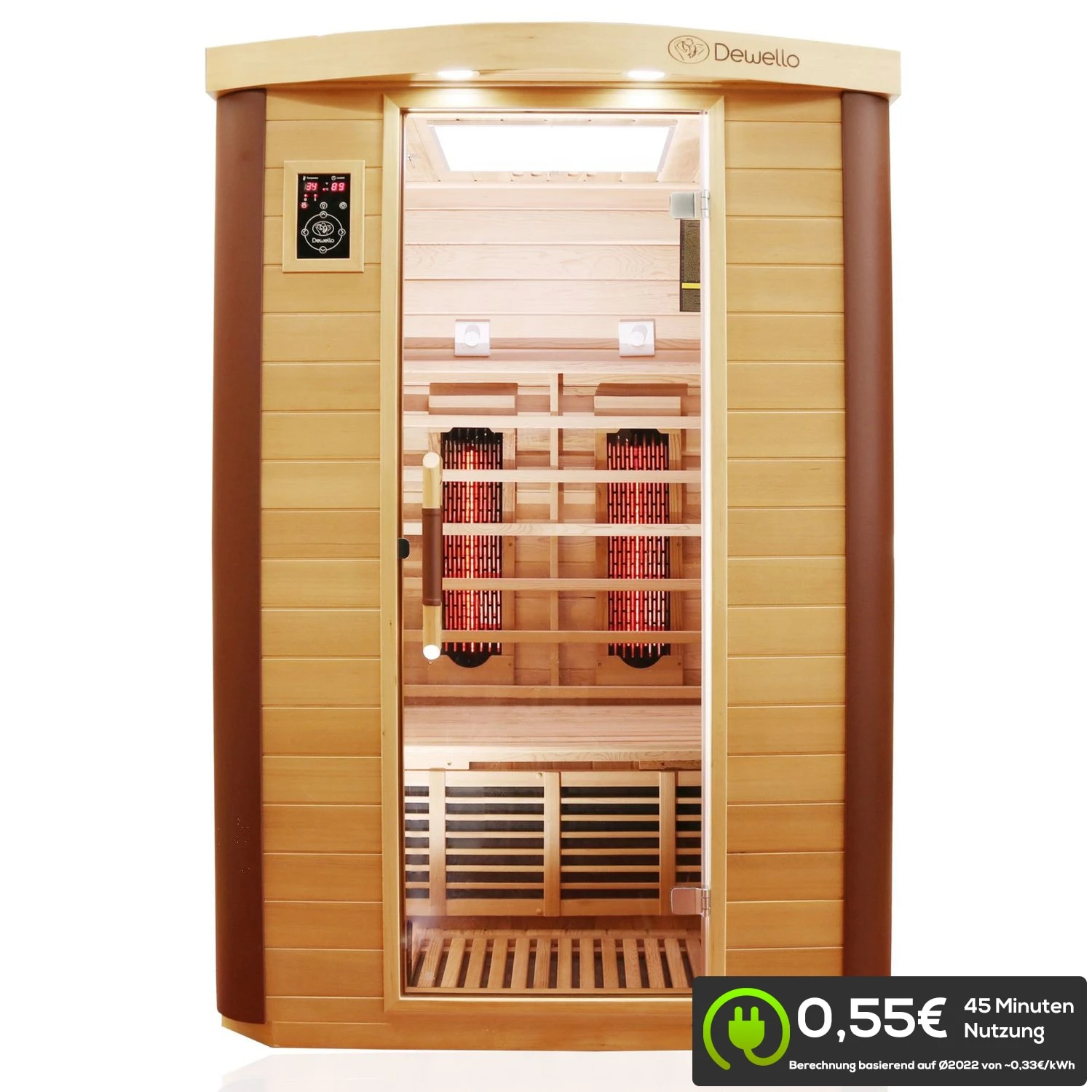 Die Kosten pro Saunagang bei dieser Infrarotkabine liegen bei etwa 0,37 € Die Berechnung basiert auf einem Preis von 0,50€ pro kWh. Es wird von einer effektiven Nutzung von 20 Minuten ausgegangen. Bei Infrarotkabinen mit Vollspektrumstrahler wird keine Aufheizzeit benötigt, da die Leistung direkt abgerufen wird.