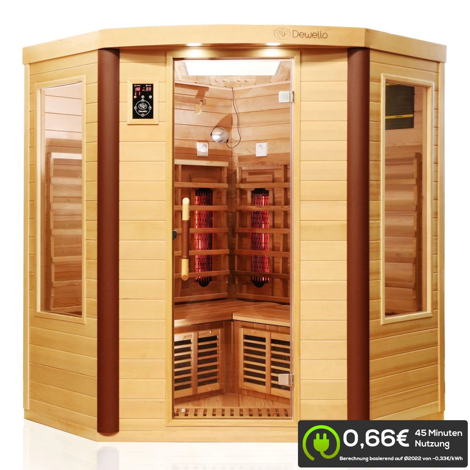 Die Kosten pro Saunagang bei dieser Infrarotkabine liegen bei etwa 0,44 € Die Berechnung basiert auf einem Preis von 0,50€ pro kWh. Es wird von einer effektiven Nutzung von 20 Minuten ausgegangen. Bei Infrarotkabinen mit Vollspektrumstrahler wird keine Aufheizzeit benötigt, da die Leistung direkt abgerufen wird.