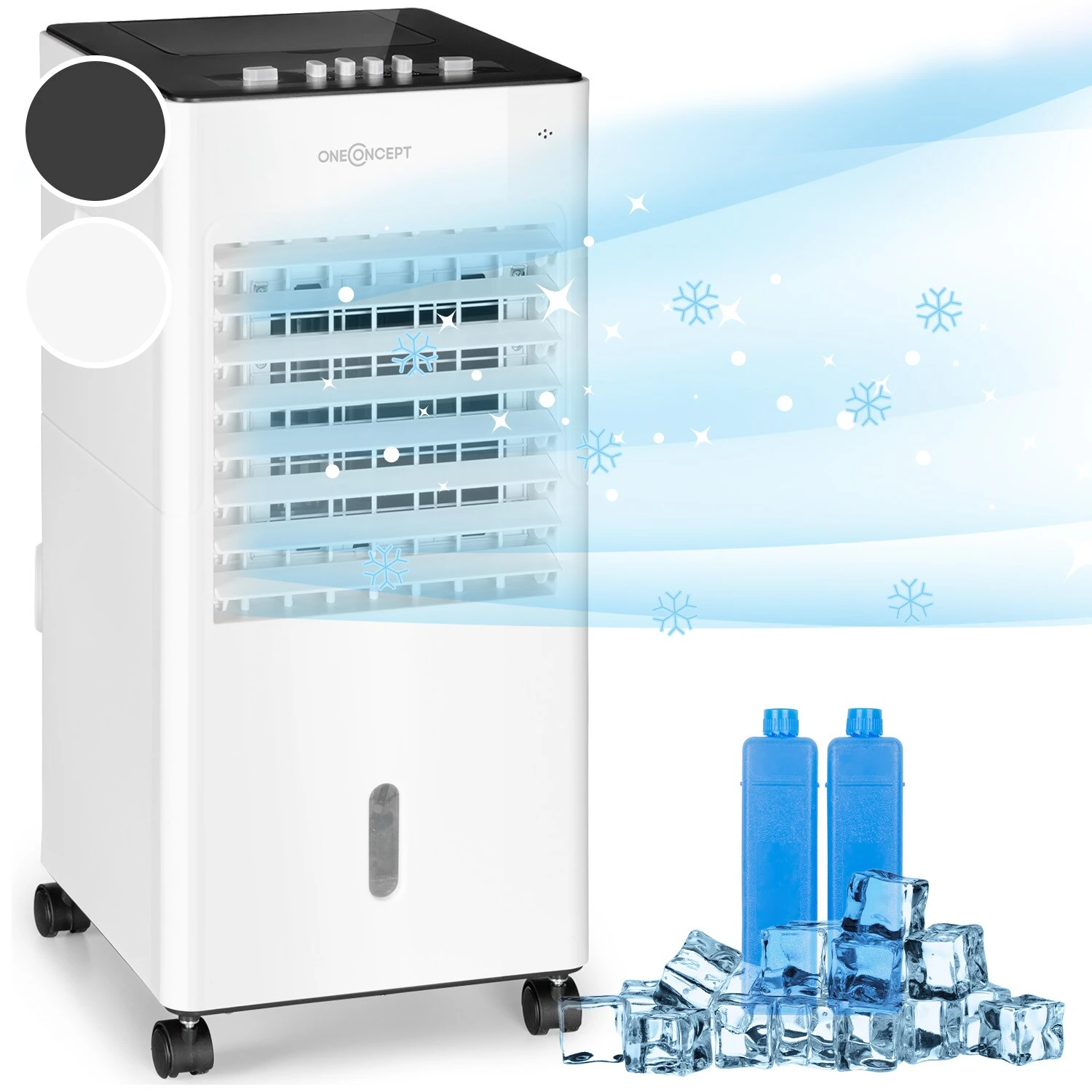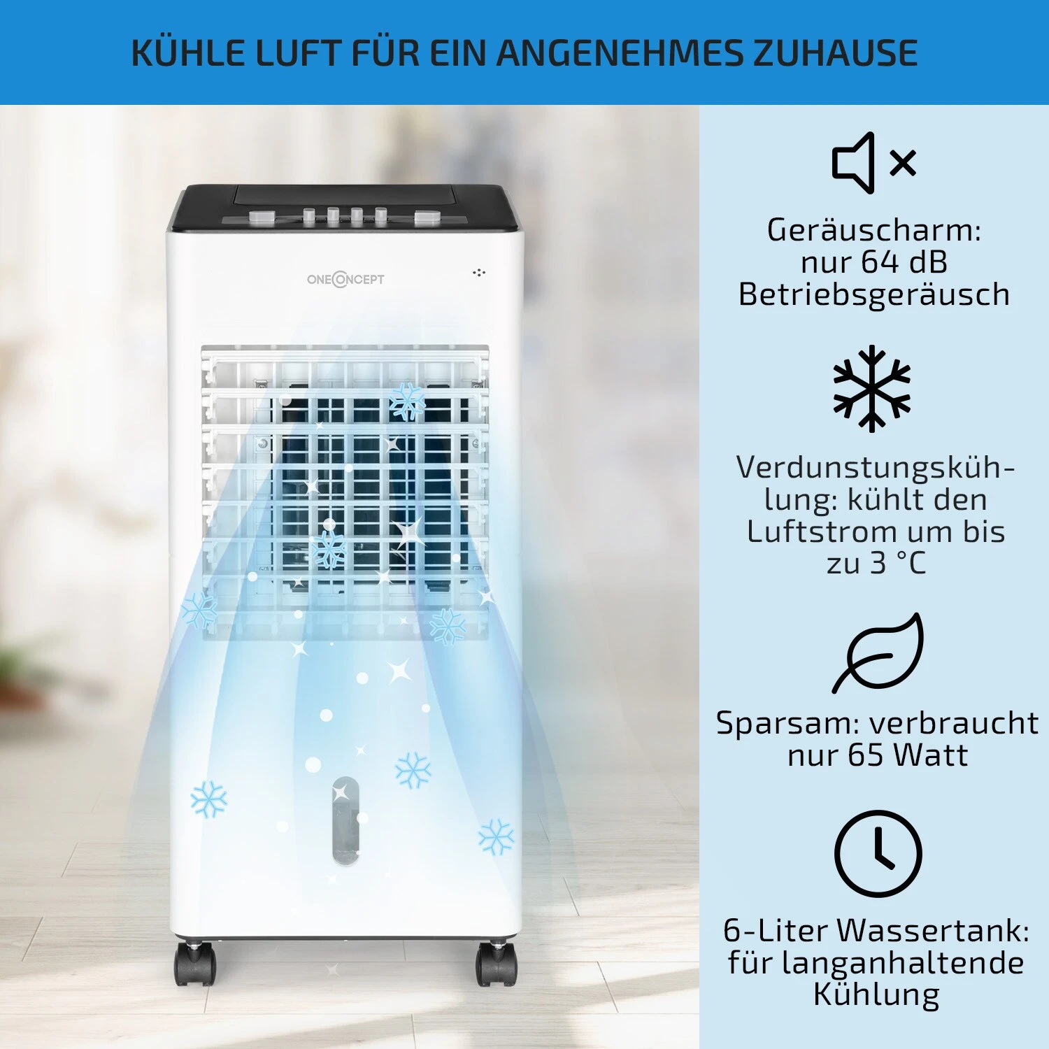oneConcept Freshboxx 3-in-1 Luftkühler | Ventilator Luftkühler Luftbefeuchter | 65 W | Luftdurchsatz: 360 m³/h | 3 Windstärken | Wassertank-Volumen: 6 Liter | 2 Kühlakkus | horizontale Oszillation | manueller vertikaler Luftstrom | mobil | weiß