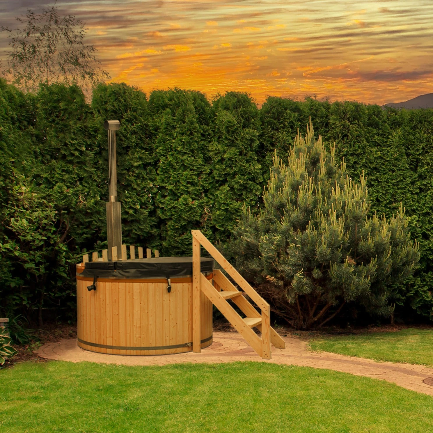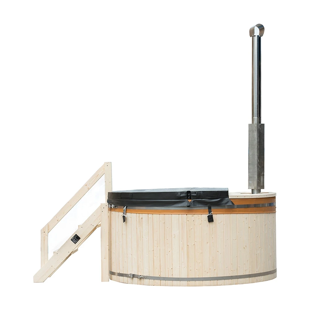 Das moderne Design, vereint mit eleganten und skandinavischen Highlights, macht den hochwertigen Outdoor Pool zu einem optischen Blickfang. Der leistungsstarke Holzofen erwärmt Ihren Hot Tub binnen kürzester Zeit auf eine angenehme Badetemperatur von ca. 30 – 40C°. Durch die optimale Größe und dem runden Design können Sie Ihren Hot Tub perfekt in Ihrem Garten platzieren und den Ausblick genießen. Das massive Holz der Außenverkleidung verspricht Langlebigkeit und besticht mit seinem modernen Aussehen. Die Innenverkleidung besteht aus einer hochwertigen und strapazierfähigen PVC-Folie und sorgt dafür, dass das Holzinnere dicht und geschützt bleibt. Durch die bequemen Holzbänke im Hot Tub erleben Sie höchsten Sitzkomfort.