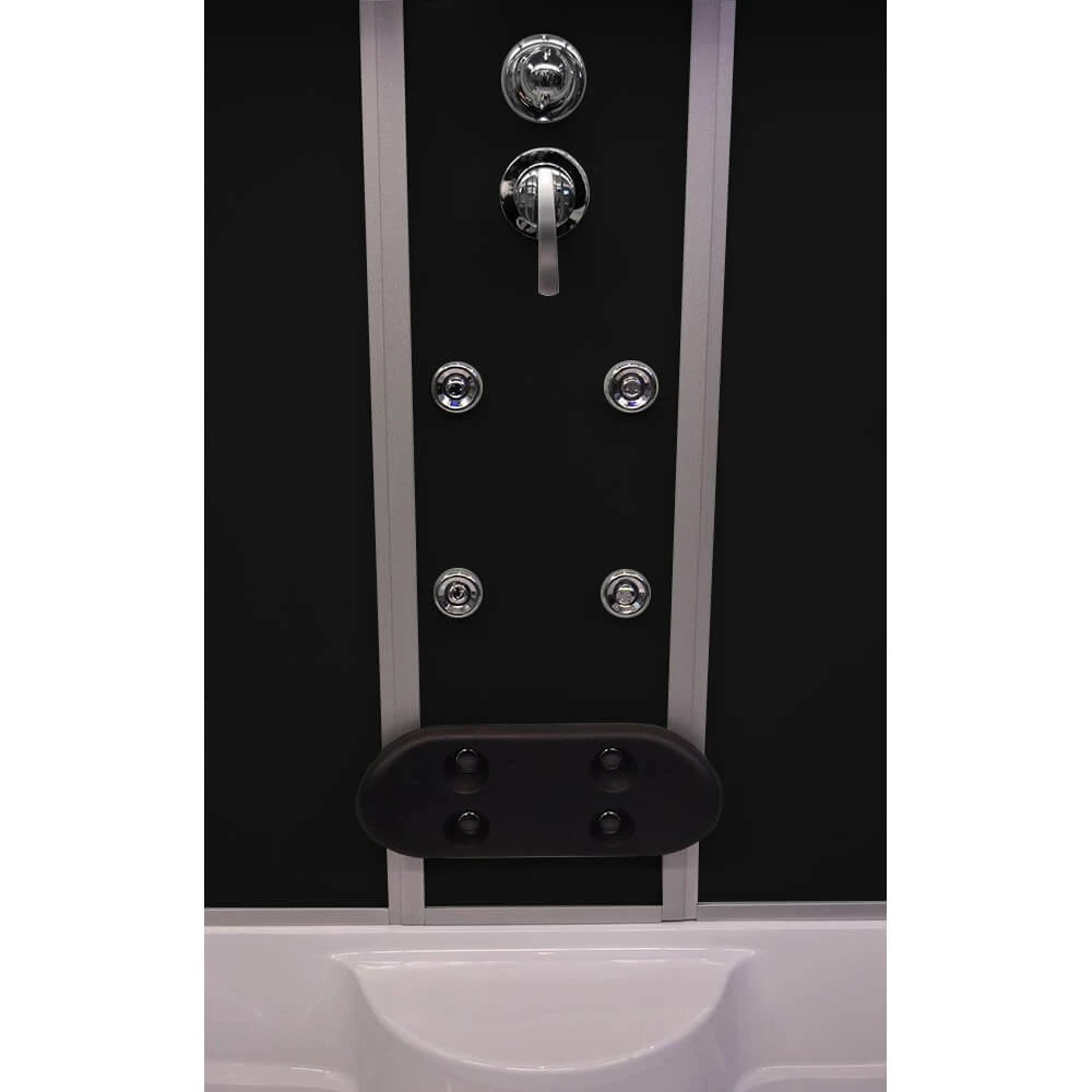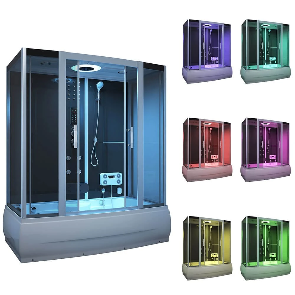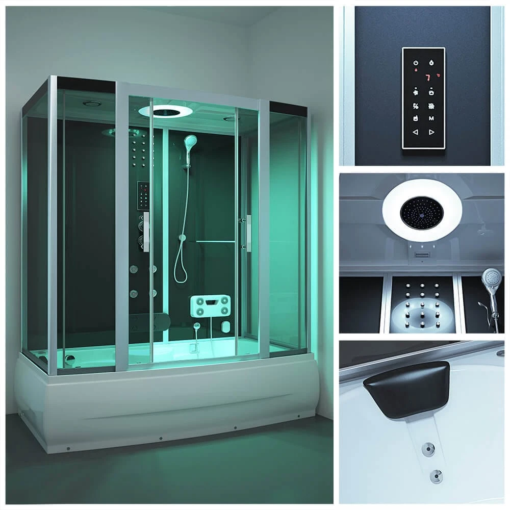 Dieses komplette Wellness-Erlebnis lässt Ihr Herz höherschlagen. Die Diamond BIG wurde eigens ergonomisch konzipiert, damit es überhaupt möglich ist, auf solch kleinstem Raum solch eine Ausstattung zu gewährleisten. Egal ob Duschen, Baden (Whirlpool) oder Saunieren, die Diamond BIG macht alles, egal in welcher Kombination, auf Knopfdruck möglich. Selbstverständlich ist auch der gewöhnliche Gebrauch über eine Handbrause, die über die befestigte Duschstange justierbar ist, möglich. Das moderne Design, gepaart mit guter Funktionalität, runden unseren Topseller ab. Entspannen Sie sich bei einem beruhigenden Whirlpoolgang unter dem blauen Deckenhimmel, lassen Sie die Seele bei einem warmen Tropenregen baumeln, oder verlieren Sie Ihren Stress bei einem Dampfbad, optional auch mit Duftaroma. Das integrierte Ozon-Desinfektionssystem sorgt für rückstandslose, umweltfreundliche Reinigung. Der in der Wanne eingefasste Sitz und die Antirutschstruktur im Wannenboden gewährleisten den sicheren Gebrauch. Die integrierte Fußmassage für eine entspannte Reflexzonentherapie und die 8 Rückenmassagedüsen, die an der Mittelkonsole Ihren Rücken massieren, machen das Entspannungserlebnis perfekt. Nicht nur die Eigenschaften sind herausragend, auch die Qualität ist für den angegebenen Preis mehr als fair. Hier zu erwähnen sind vor allem die 5 mm starke, schwarzgetönte ESG-Vollverglasung der “Diamond-Serie”, sowie auch die Aluminium-Rahmenkonstruktion und das computergesteuerte Touch-Bedienelement. Die auf fast jeden Untergrund anzupassenden höhenverstellbaren Füße der Duschwanne machen dieses Produkt nahezu an jedem Ort montierbar.