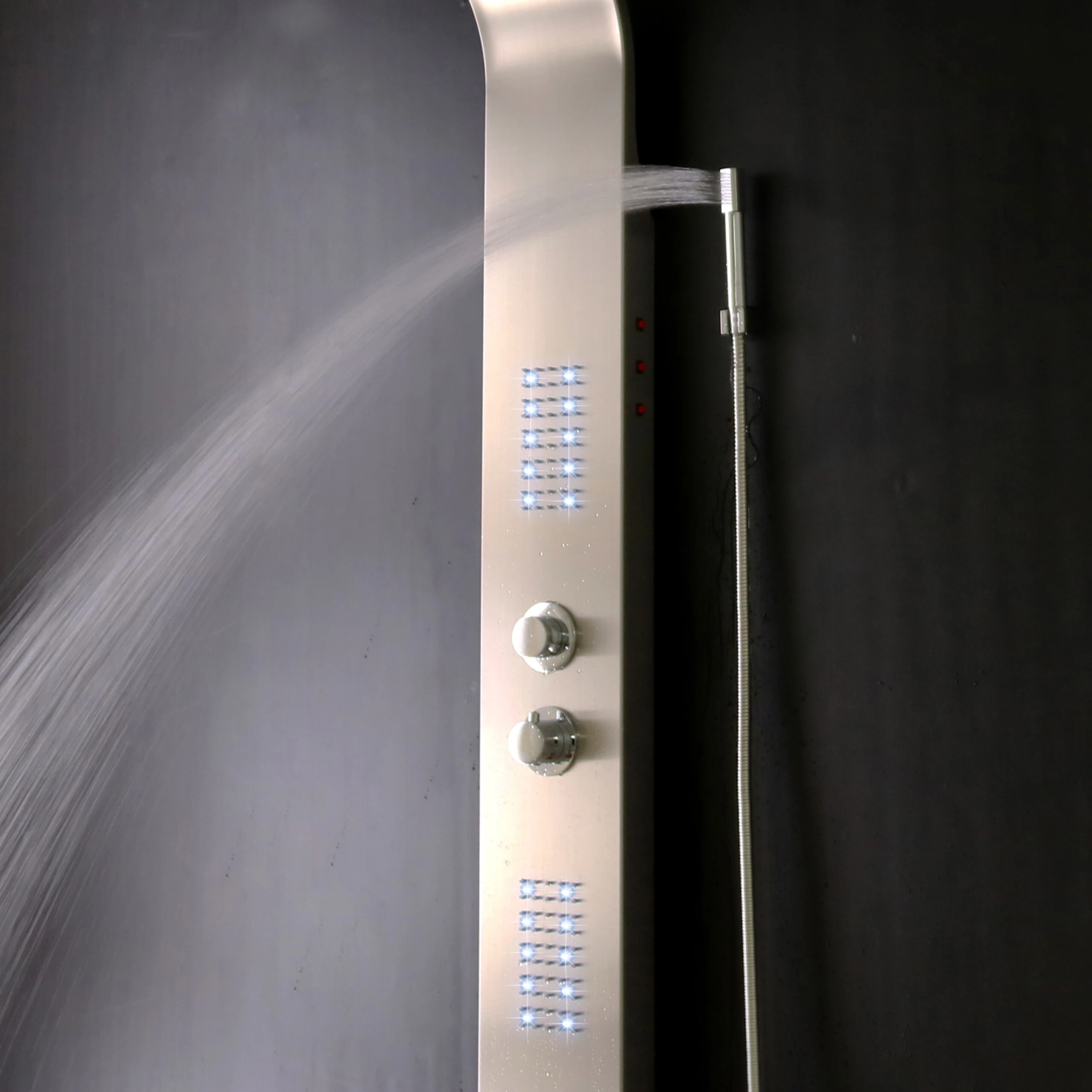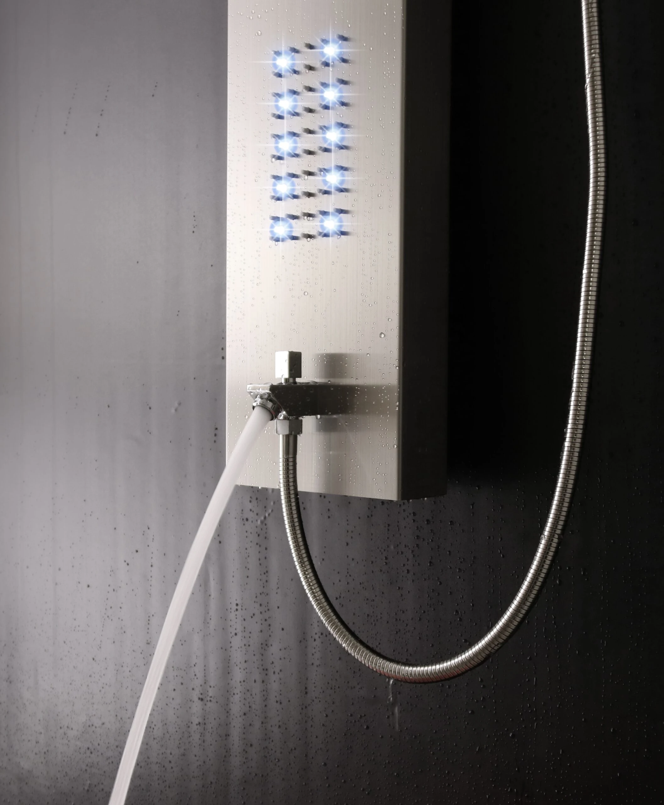 Das Duschpaneel arbeitet mit einer 5-fachen Wasserverteilung. Über die integrierte Mischarmatur kann man nach Belieben die Wasserfallfunktion,