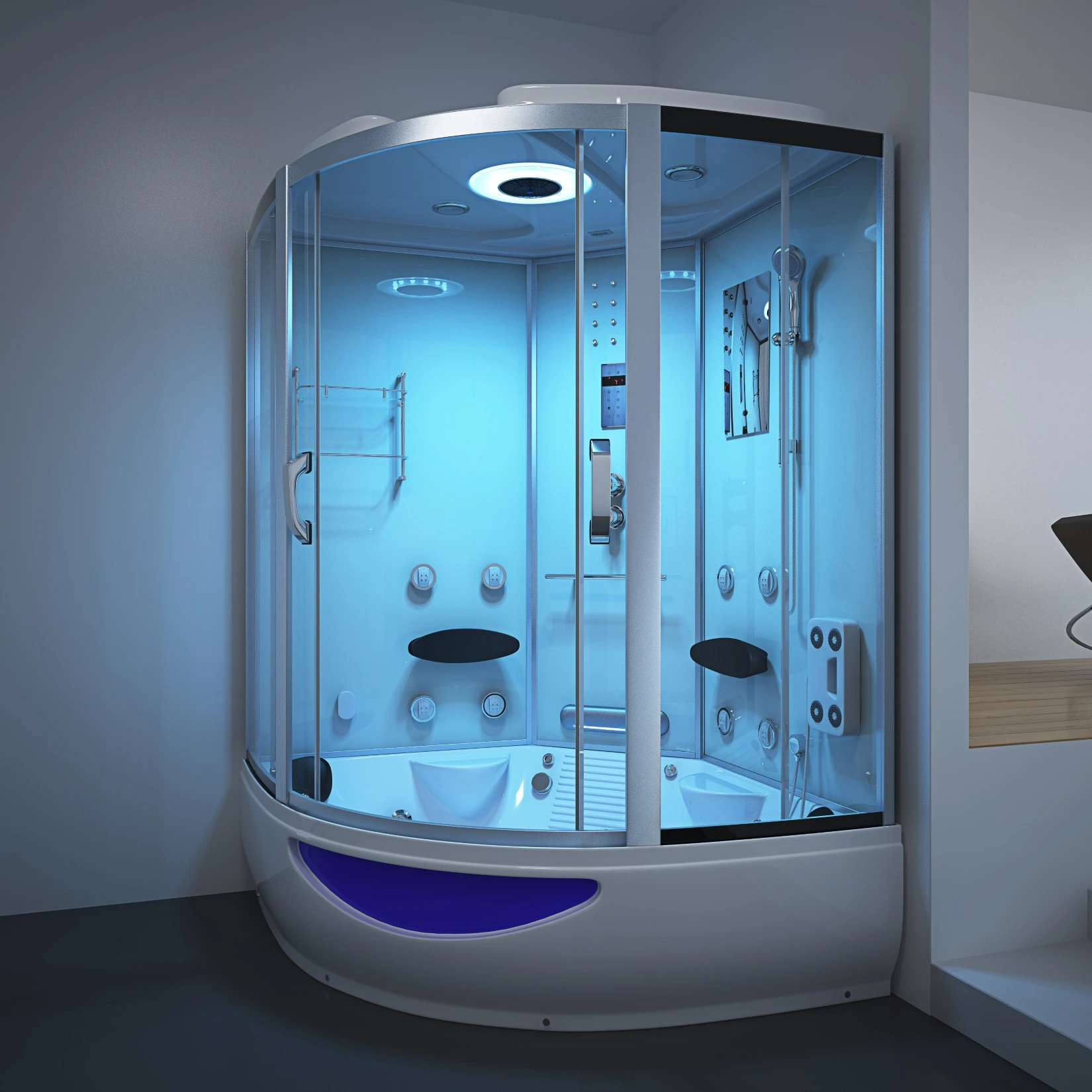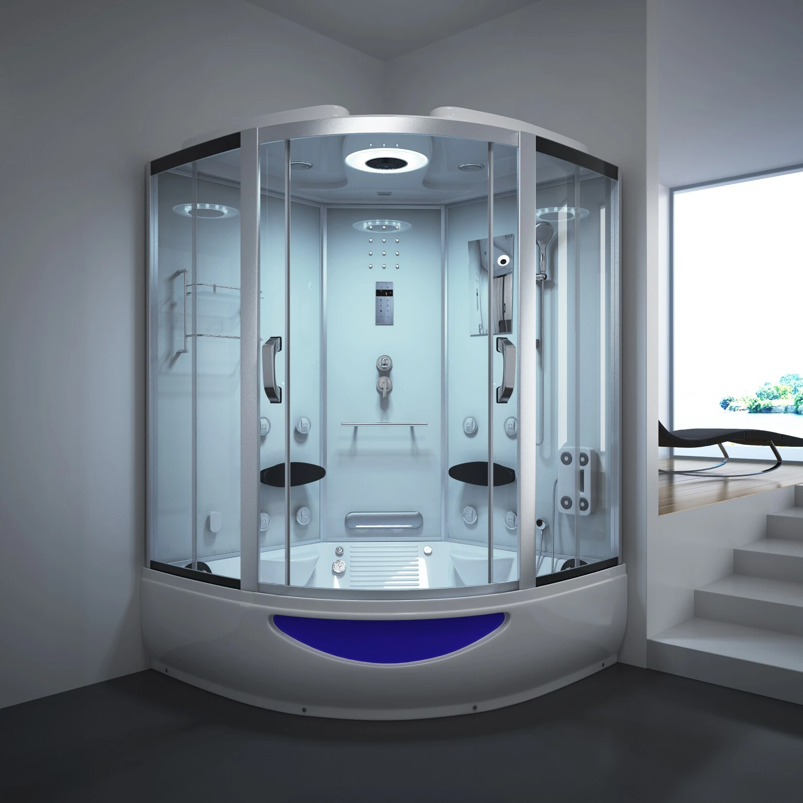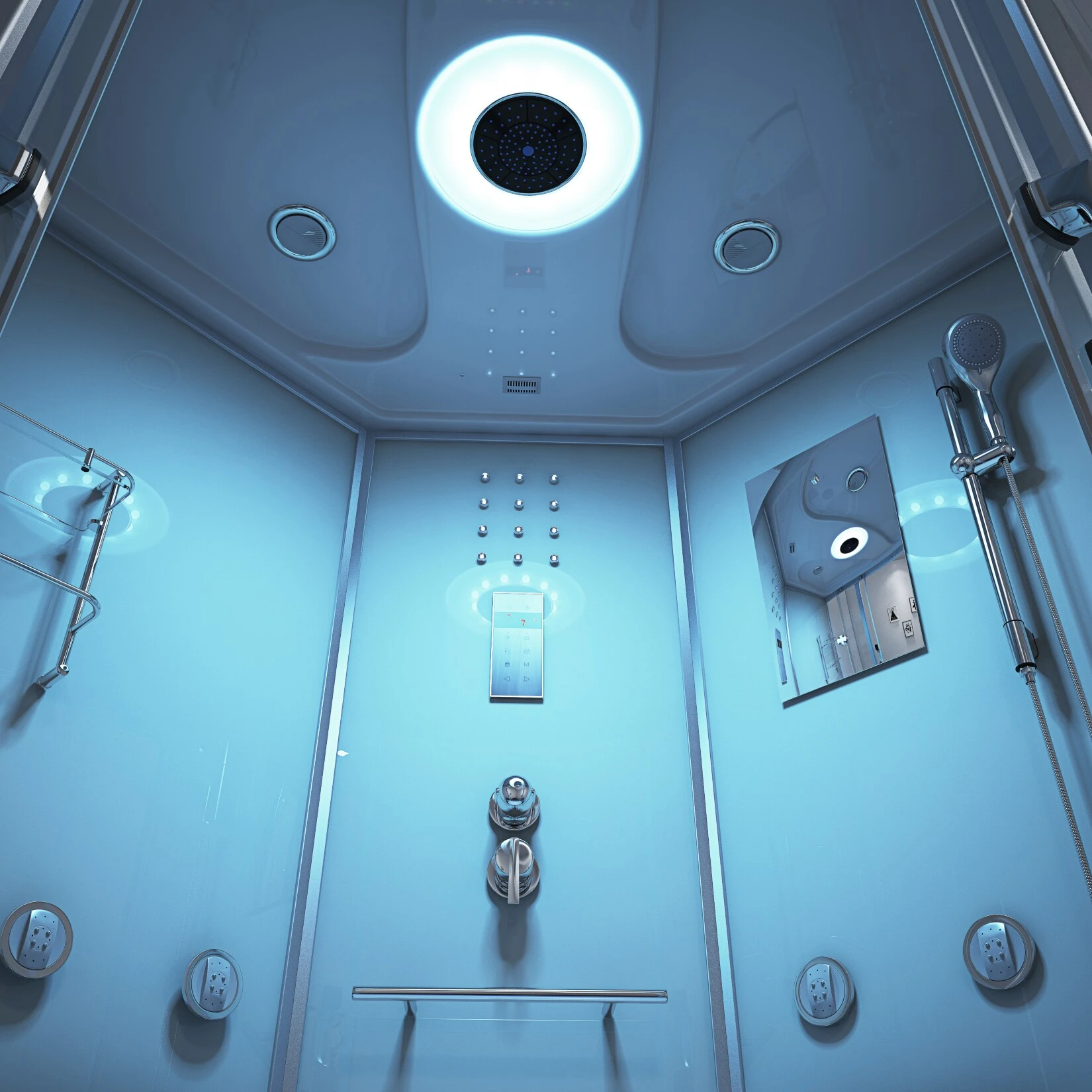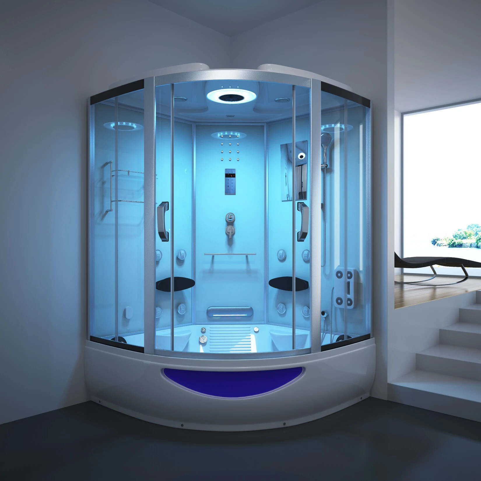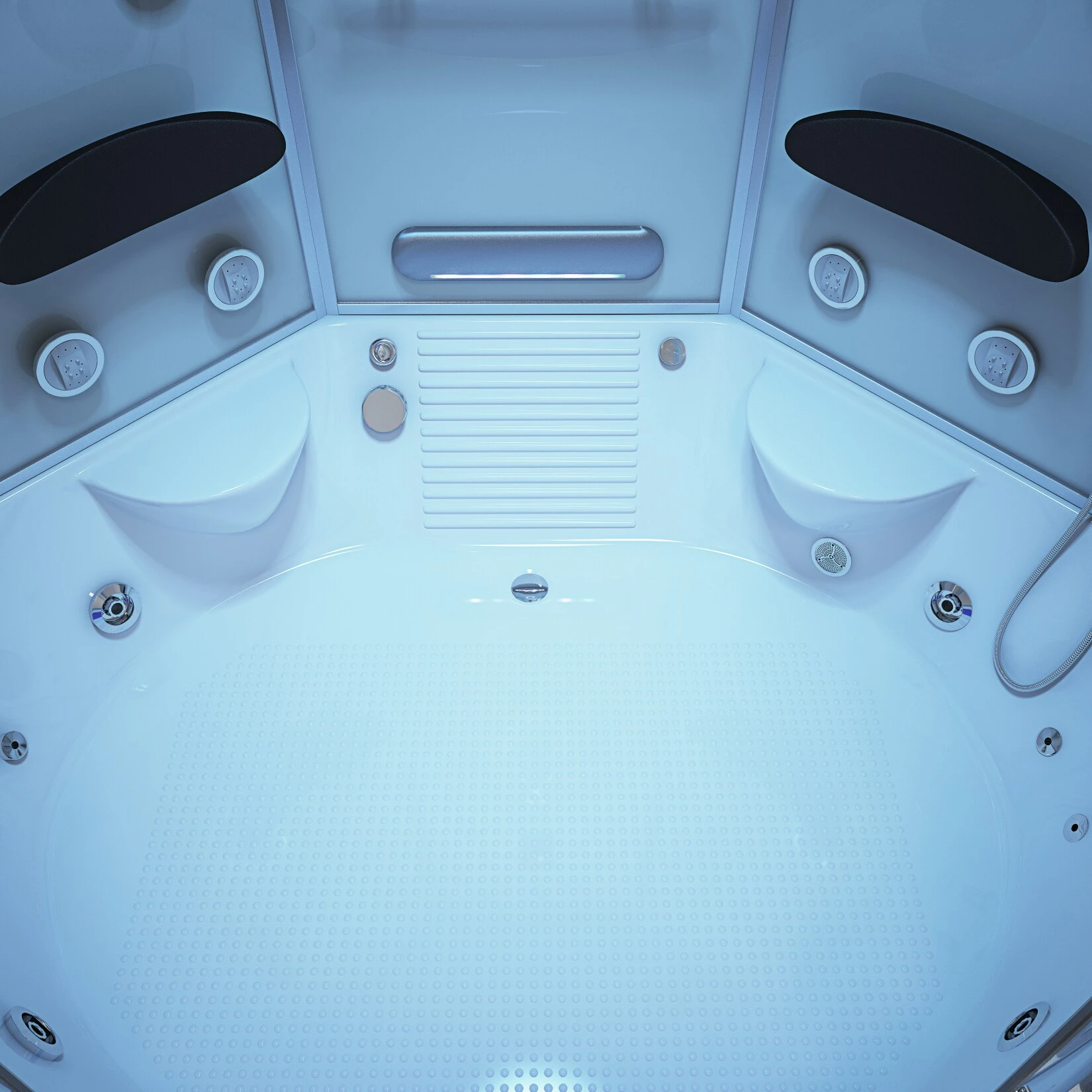 Wenn Sie ein Produkt suchen, das keine Wünsche offen lässt, ist diese geräumige Dampfdusche die perfekte Lösung. Mit diesem Ziel vor Augen, wurde die Exclusive eigens von uns ergonomisch konzipiert. Egal ob Duschen, Baden (Whirlpool) oder Saunieren, die Exclusive macht alles, egal in welcher Kombination, auf Knopfdruck möglich. Dank der beachtlichen Größe von 150 x 150 cm auch gerne zu zweit. Selbstverständlich ist auch der gewöhnliche Gebrauch über eine Handbrause, die über die befestigte Duschstange justierbar ist, möglich. Das moderne Design, gepaart mit guter Funktionalität, runden unseren Topseller ab. Entspannen Sie sich bei einem beruhigenden Whirlpoolgang unter der innovativen Farblichttherapie, lassen Sie die Seele bei einem warmen Tropenregen baumeln, oder verlieren Sie Ihren Stress bei einem Bad mit Dampf, optional auch mit Duftaroma. Die Exclusive ist nicht nur mit einer in die Tropenbrause integrierten Farblichttherapie ausgestattet, sondern zusätzlich auch noch mit einer Farblichttherapie im Wanneneinlass. Diese lässt den Wasserfall und auch das komplette Wasser der Wanne in beruhigenden Farben schimmern. Das integrierte Ozon-Desinfektionssystem sorgt für rückstandslose, umweltfreundliche Reinigung. Die zwei in der Wanne eingefassten Sitze und die Antirutschstruktur im Wannenboden gewährleisten den sicheren Gebrauch. Die integrierte Fußmassage für eine entspannte Reflexzonentherapie und die 8 Rückenmassagedüsen, die in den Wänden hinter den beiden Sitzen integriert sind und Ihren Rücken massieren, machen das Entspannungserlebnis perfekt. Nicht nur die Eigenschaften sind herausragend, auch die Qualität ist für den angegebenen Preis mehr als fair. Hier zu erwähnen sind vor allem die 5mm starke, weißgetönte ESG-Vollverglasung der “Exclusive”, sowie auch die Aluminium-Rahmenkonstruktion und das computergesteuerte Touch-Bedienelement. Die auf fast jeden Untergrund anzupassenden höhenverstellbaren Füße der Duschwanne machen dieses Produkt nahezu an jedem Ort montierbar.