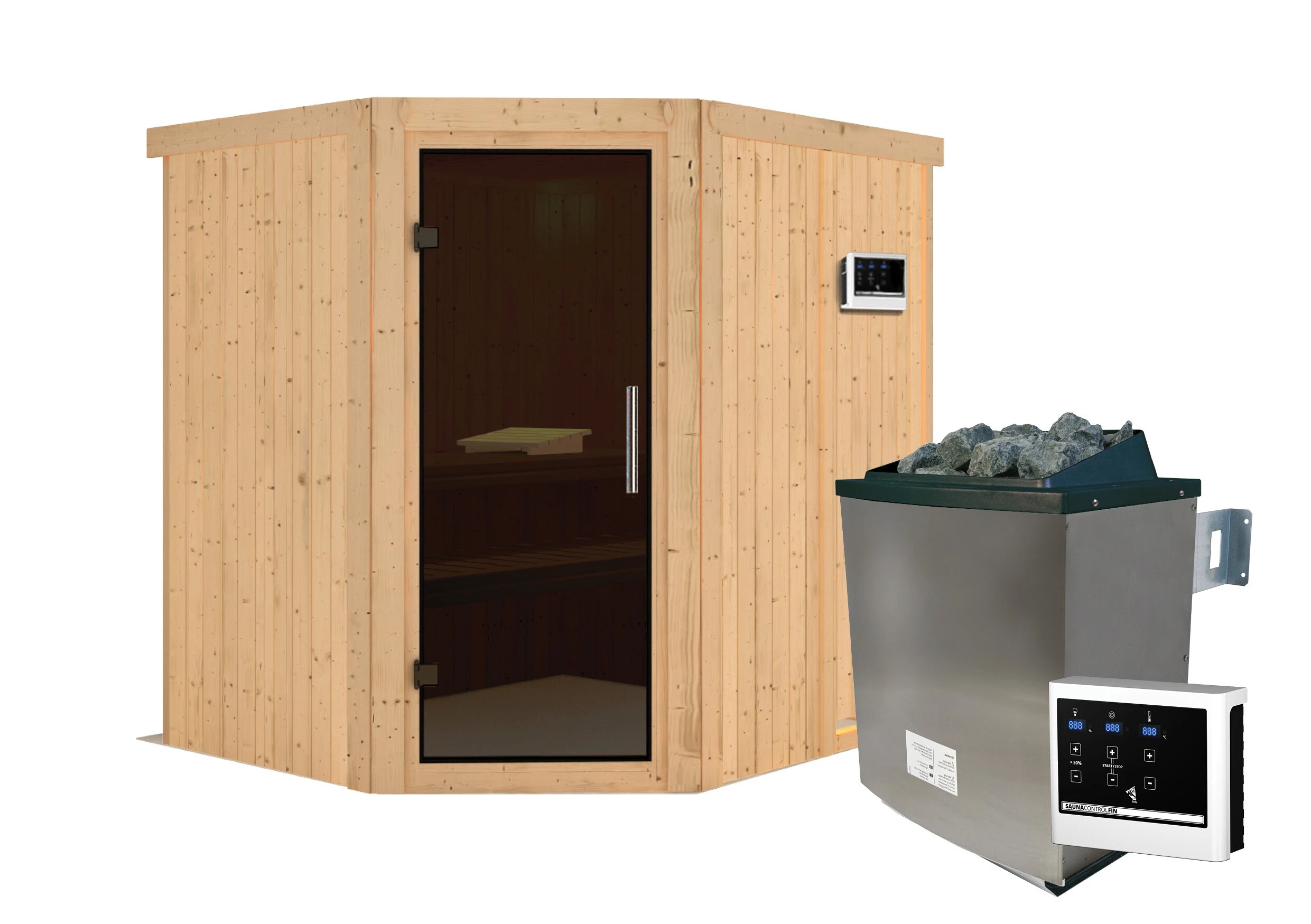 Mit der Sauna Mitchell können Siesich die optimale Entspannung nach Hause holen. Der Aufbau gestaltet sich durchschon vorgefertigte Bauelemente als einfach und schnell. Diese Elementsaunabietet dank ihrer Wandstärke von 68 mm und der im Wandelement eingebautenMineralwolldämmung eine hervorragende Energieeffizienz. Die vorgefertigtenWandelemente, die außen mit Softline-Profilholz verkleidet sind, sind leichterals Holz und haben gleichzeitig einen höheren Dämmwert. Die Sauna verfügt überein Außenmaß von 196 cm x 170 cm und ein Innenmaß von 181 cm x 155 cm. DasVolumen der Sauna beträgt 5,3 cbm. Durch die formschöne graue Graphittürgelangen Sie in das zum entspannen einladende Innere der Sauna mit Ihren 2einladend aussehenden Liegen. Die Liegen sind ausreichend breit bemessen undbieten Ihnen die optimale Entspannung. Die Lieferung erfolgt inkl.Ofenschutzgitter, 9kw Saunaofen, der passenden Saunasteuerung, allen benötigtenAnschlusskabeln, einer Saunaleuchte und einem Zubehörset. Zusätzlich dazu gibtes gratis ein Geschenkpaket. Unsere Elementsaunen haben 2 Sichtseiten und 2Seiten, welche mit einer Hartfaserplatte ausgestattet sind. Somit bietet dieSauna Mitchell perfekte Wellnessstunden ganz privat bei Ihnen zuhause.