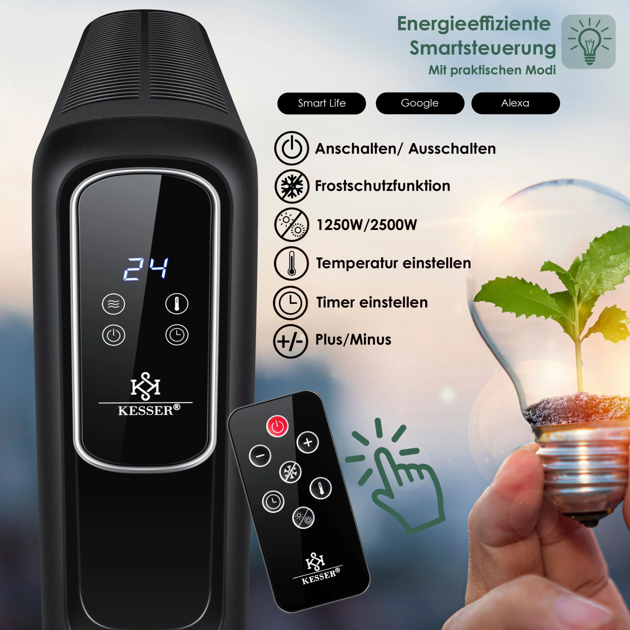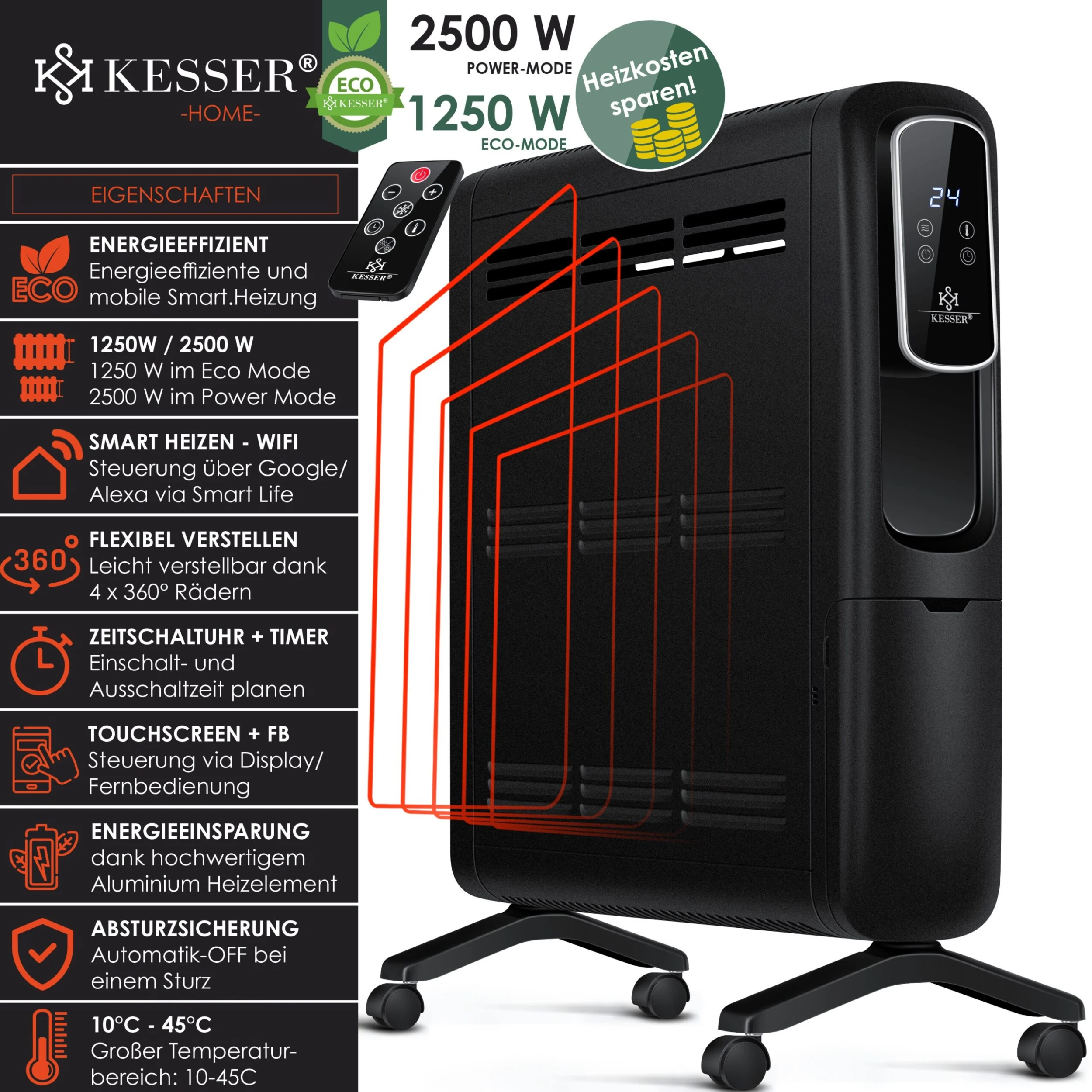 KESSER Elektrische Heizung 2500W mit WiFi Smart Home – App und Fernbedienung, LCD-Display mit Touchscreen, Inkl. Timer und Zeitschaltuhr, Wochenplaner und Thermostat, Umkippschutz und Kindersicherung, Eco-Mode und Power-Mode