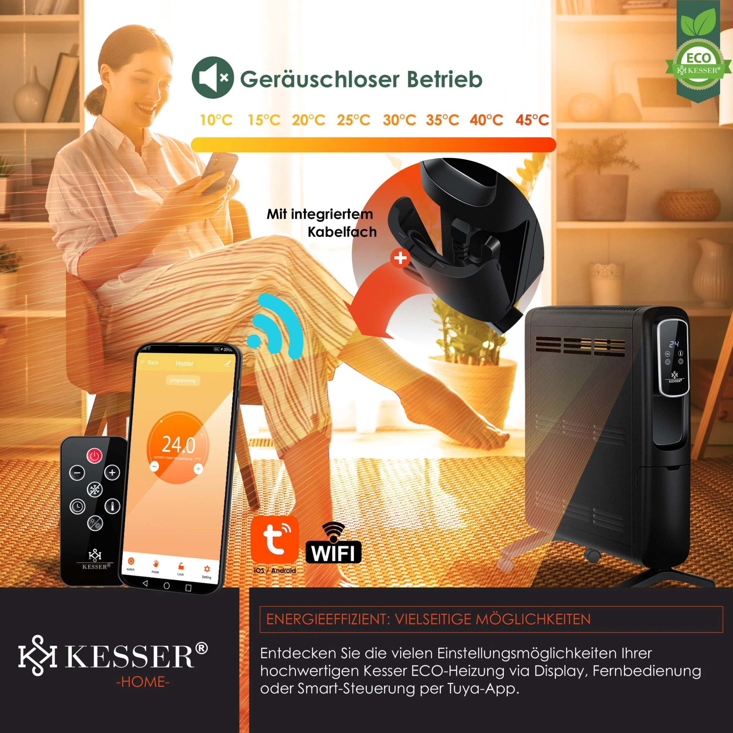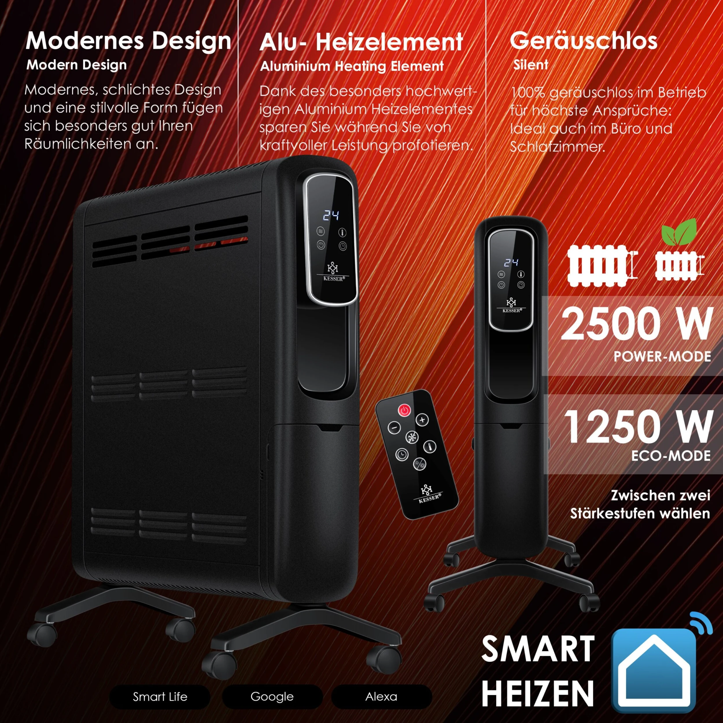 Unser Heizkörper aus dem Hause KESSER ist die optimale Lösung für lange Herbst– und Winterabende. Der Smart-Home-Konvektor eignet sich perfekt für Räume, die aufgrund von schwachen Heizkörpern oder undichten Fenstern eine leistungsstarke Wärmequelle benötigen. Ebenso kann der Radiator ideal für einen kurzen Urlaub im Ferienhaus genutzt werden. Dank der integrierten Rollen ist die mobile Heizung flexibel und eignet sich wunderbar für die Beheizung aller Räume, der Hobby–Garage, Werkstatt, dem Gartenhaus, Keller u.v.m. – Zudem ist er eine clevere Alternative zu herkömmlichen Wandheizungen mit manueller Bedienbarkeit.