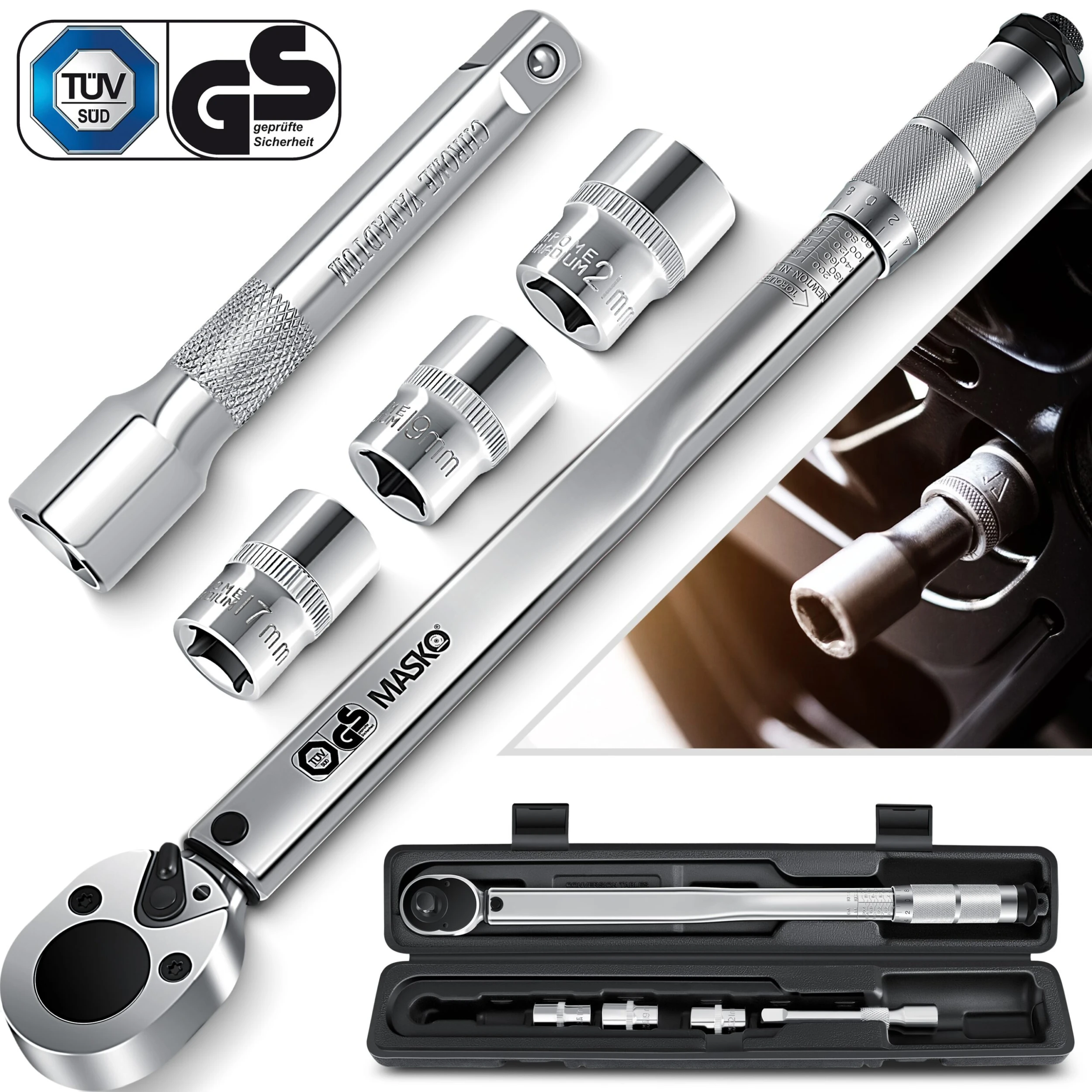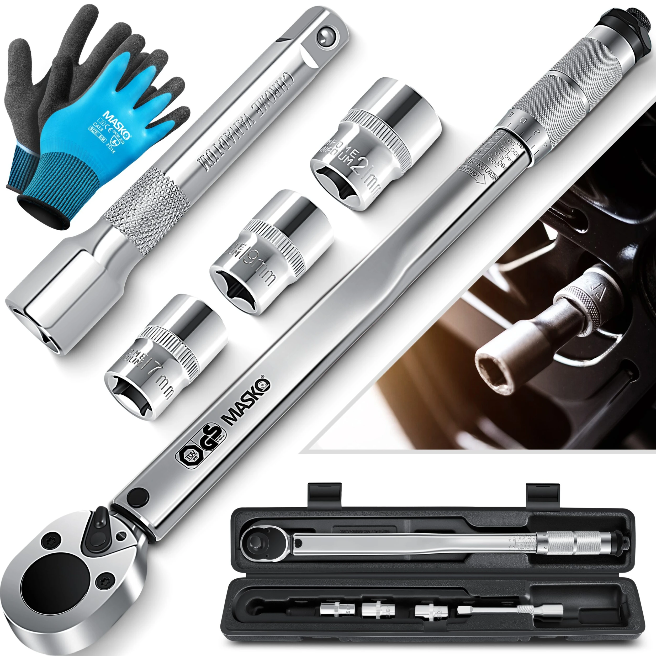 MASKO 6-teiliges Drehmomentschlüssel Set inkl. 3 Aufsätzen, Montagehandschuhen praktischer Verlängerung und stabiler Transportbox.