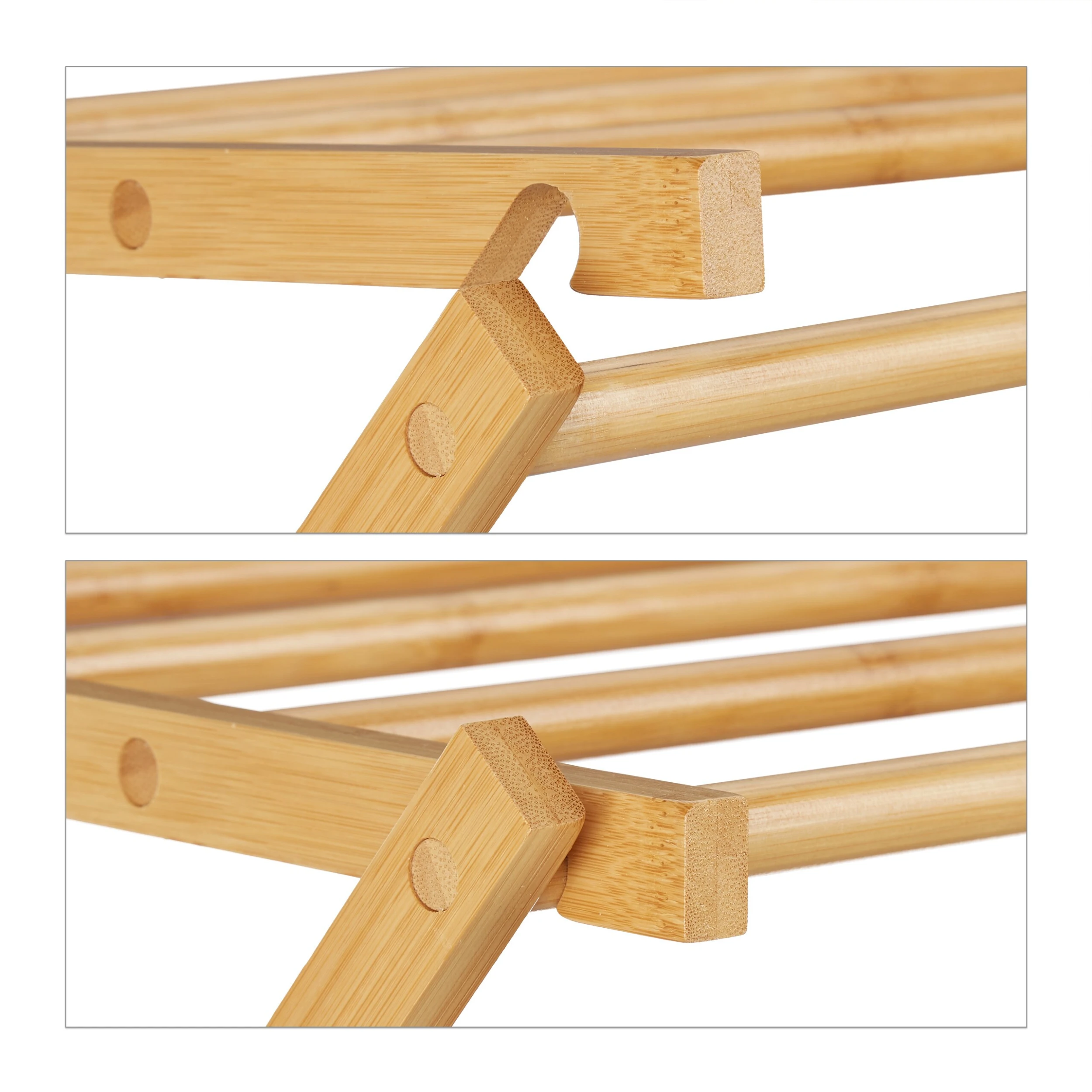 Der Handtuchständer ist fertig montiert und mit wenigen Handgriffen aufgestellt. Der schmale Standtrockner ist frei im Raum platzierbar, einfach auszuziehen und wieder zusammenzuklappen: Ein echter Platzsparer. Auf 11 Stangen und insgesamt 6 Etagen bietet der Handtuchhalter Platz für Ihre Handtücher. Aus feuchtigkeitsresistentem Bambus gefertigt, sorgt der Handtuchtrockner für sanftes Trocknen bei guter Luftzirkulation. Als Turmwäscheständer ist er auch für eine kleine Wäscheladung geeignet.