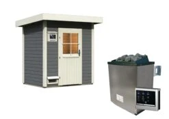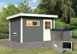 Karibu Saunahaus “Ondo 1” SET Terragrau Mit Ofen 9 KW Ext. Strg, Kabel, Dachfolie, Fenster