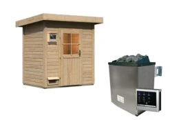 Karibu Saunahaus “Ondo 1” SET Naturbelassen Mit Ofen 9 KW Bio Ext. Strg, Kabel, Dachfolie, Fenster