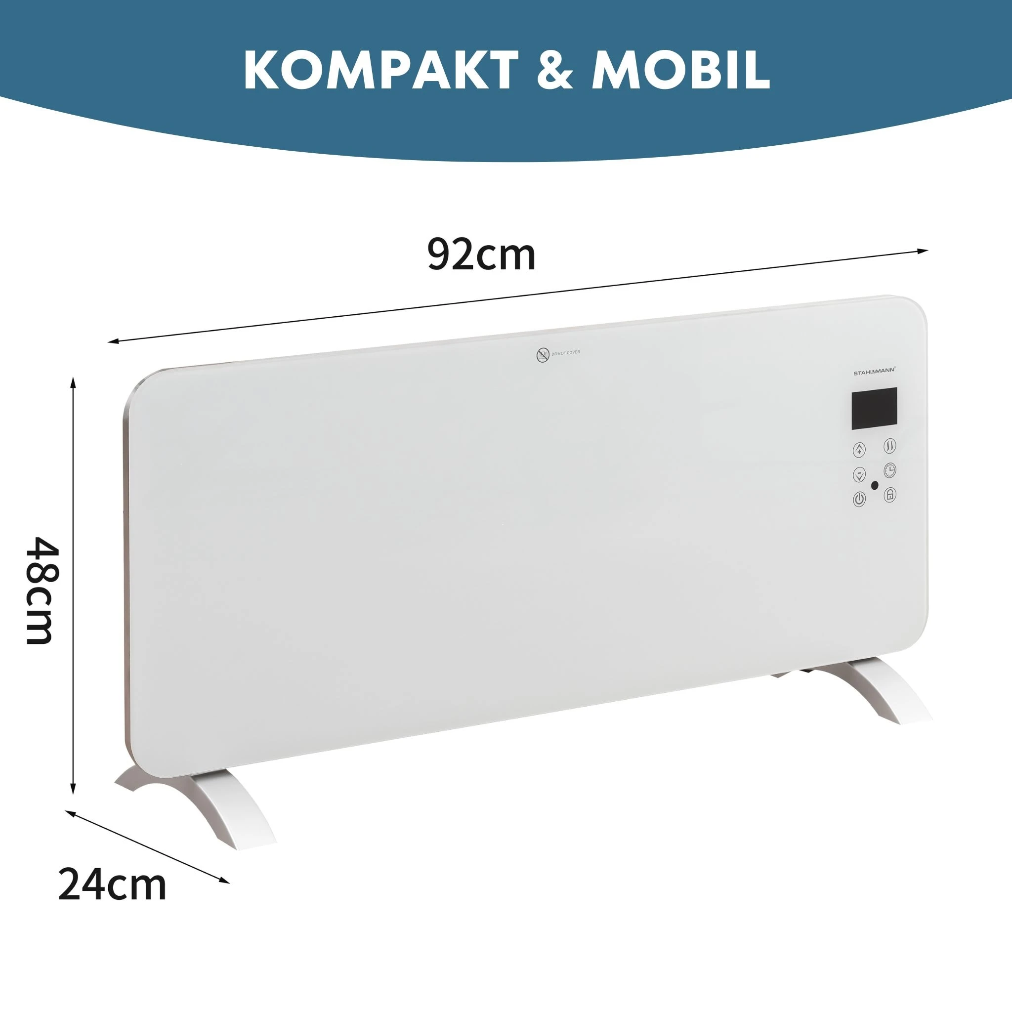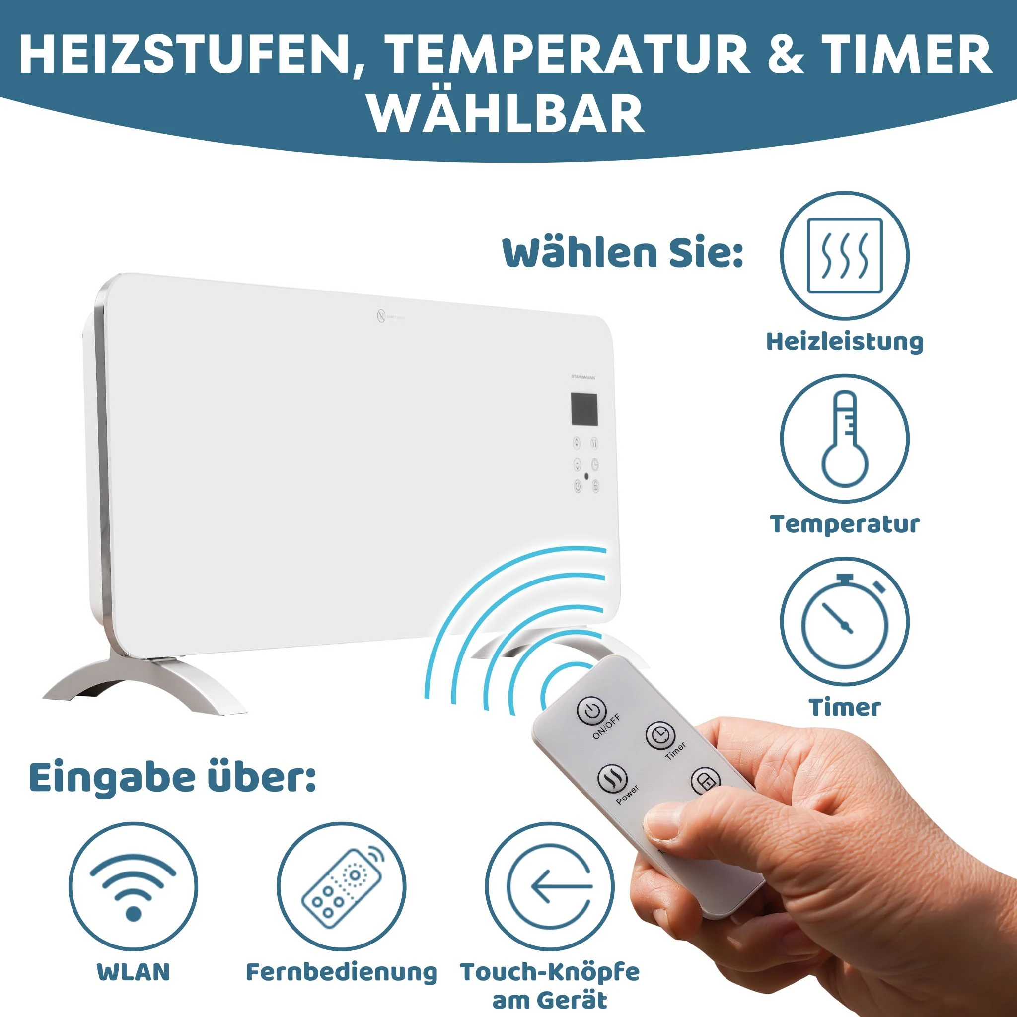 WIFI UND APP STEUERUNG: Der Glaskonvektor lässt sich ganz bequem direkt am Konvektor, über die mitgelieferte Fernbedienung oder der Smart Home APP steuern.