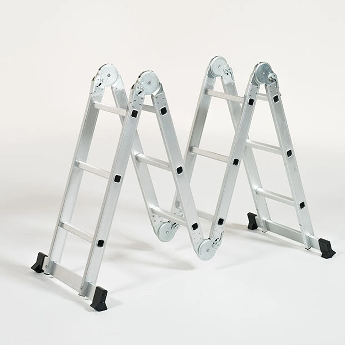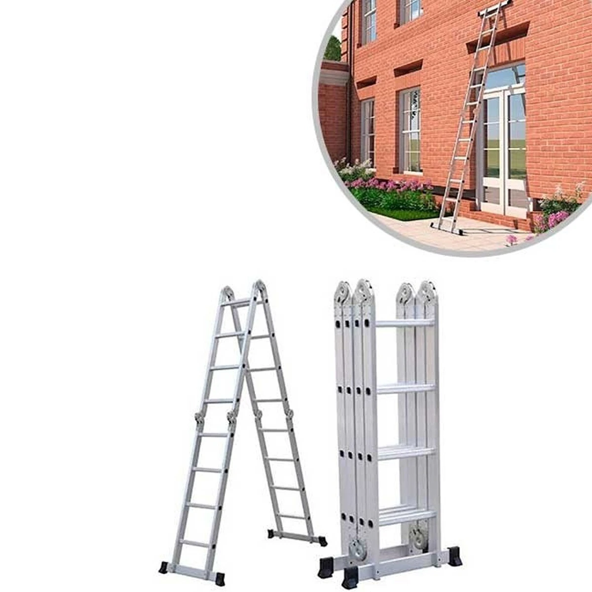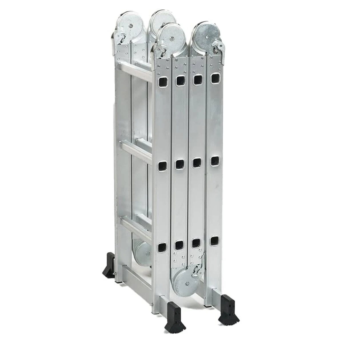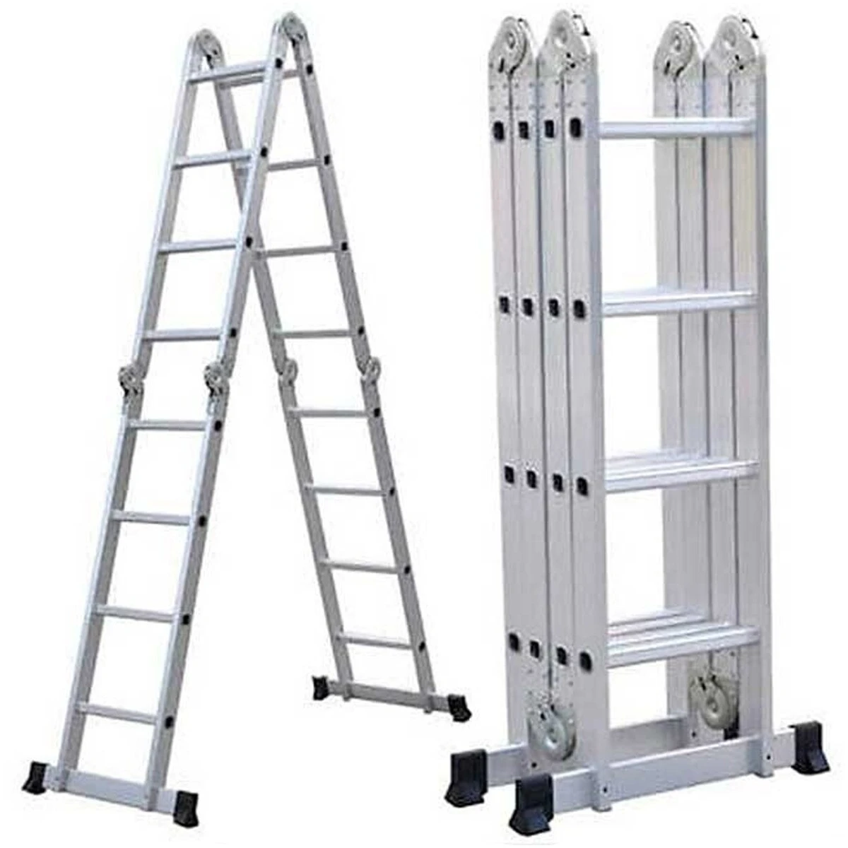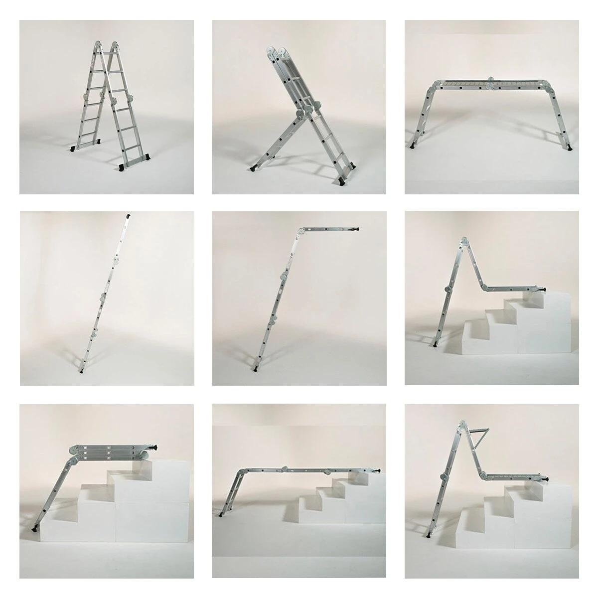 Die Mehrfachleiter ist mit viereckigen Stufen, Stützrohren und einer Aluminiumkonstruktion ausgestattet. Darüber hinaus besteht die Leiter aus hochwertigen Sicherheitsscharnieren. Sie können leicht geöffnet und verriegelt werden, um ihre Form zu ändern. Die Anti-Rutsch-Füße sorgen dafür, dass die Leiter stabil ist und nicht verrutscht. Die Leiter hat auf jeder Seite sechs Stufen.