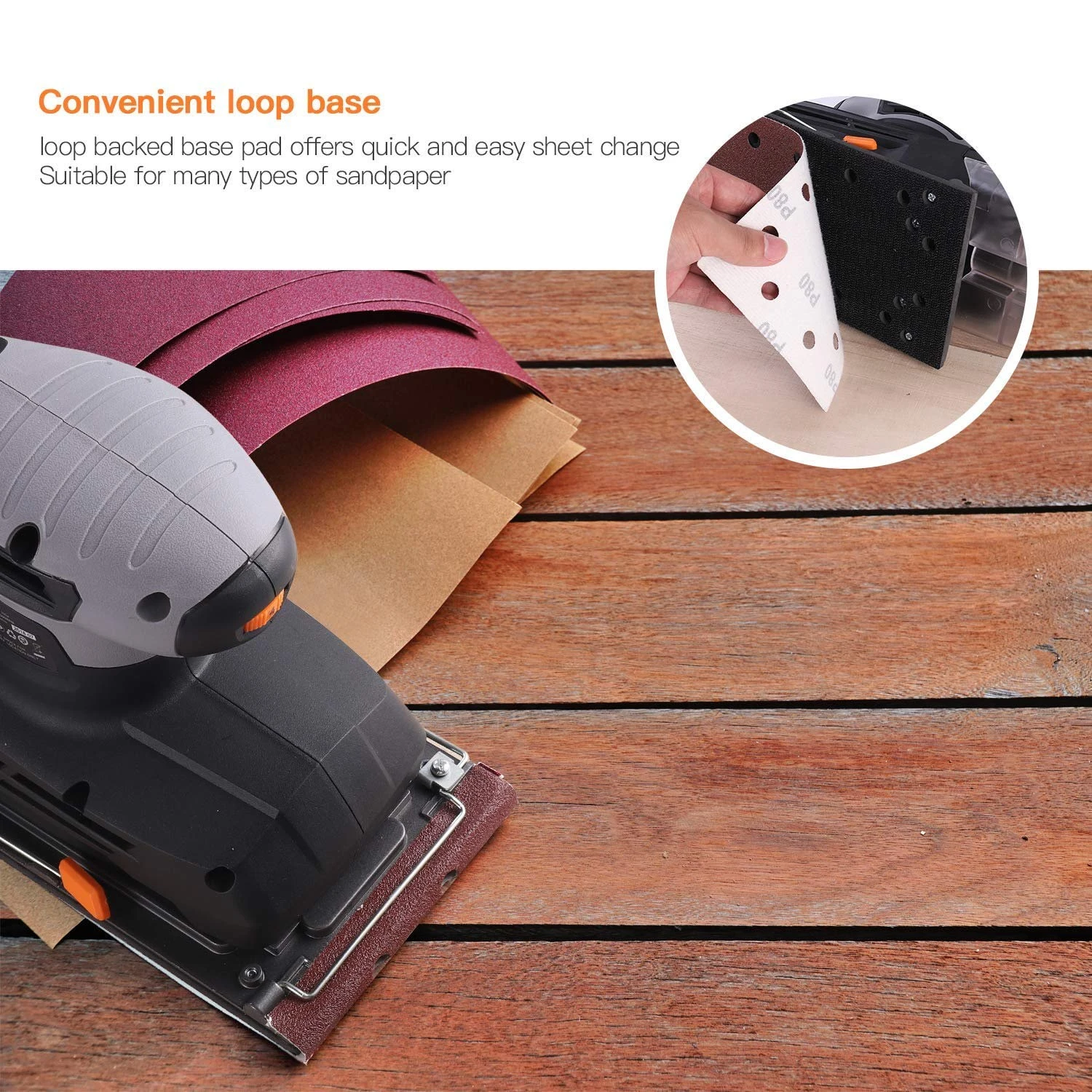 ZUVERLÄSSIGES & SCHNELLES KLEMMSYSTEM – Der Schleifer verfügt über ein zuverlässiges Klemm- und Pad-Design, das mehrere Schleifblätter einschließlich Klebepapier aufnehmen kann. Wenn Sie ein Stück Stoff auf die Schleifunterlage kleben, erhalten Sie einen Polierer.