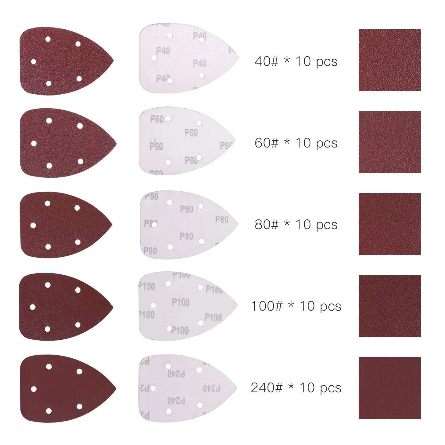 50 Stücke Maus Detail Schleifer Schleifpapier, 10 X 40 Körnung, 10 X 60 Körnung, 10 X 80 Körnung, 10 X 100 Körnung, 10 X 240 Körnung, mehr Ihre Bedürfnisse für verschiedene Aufgaben zu erfüllen. 50 Stück in Universalgröße – Es enthält 50 Stück Schleifdreiecke mit Klettverschluss in der Größe 140 x 140 x 100 mm und 5 Staublöchern, die für eine effektive Staubabsaugung von Tack life Multischleifern und anderen 140 mm Multischleifern/Dreieckschleifern/Dinkelschleifern geeignet sind. 5 Körnungsarten für vielseitige Anwendungen – je 10 Stück Schleifblätter der Körnung 40/60/80/100/240, die sich in grob, mittel, fein und extra fein unterscheiden und somit Ihren Anforderungen gerecht werden, wie z.B. für das feine, riefenfreie Schleifen von Holz und Metall, auch Farbe und Rostentfernung.