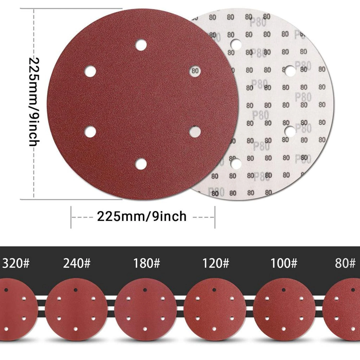 PRODUKTSPEZIFIKATIONEN – 30PCS, 80, 100, 120, 180, 240, 320 Körnungen, 9 Zoll225mm, 6 Löcher Schleifscheiben für TACKLIFE PDS03A Trockenbauschleifer, und andere 225mm Schleifer oder Polierer.