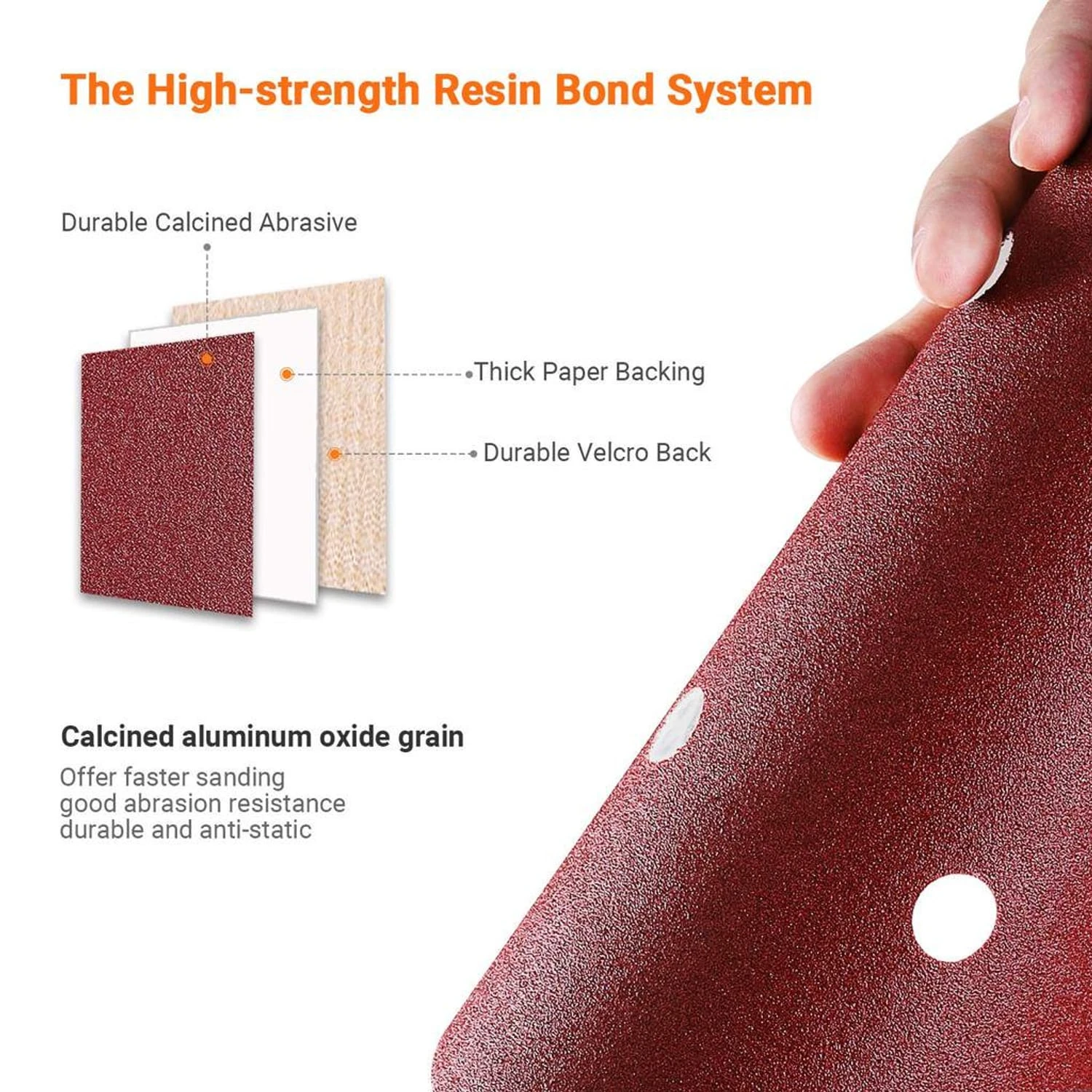 Das Design mit Haken und Schlaufe bietet mehr Komfort beim Entfernen und Ersetzen. 80, 100, 120, 180, 240, 320 Körnungen, Premium-Aluminiumoxid sorgt für die feine Schleifwirkung und verlängert die Lebensdauer. Vorgestanzt mit 6 Löchern kann effektiv Staub zu entfernen, die hohe Leistung liefert. Die spezielle Stearat-Beschichtung verhindert Verstopfung und Belastung und erhöht die Haltbarkeit. Ideal zum Schleifen von Holz, Metall, Leder, Kunststoff, Nicht-Metall, Stein, Glas und mehr.