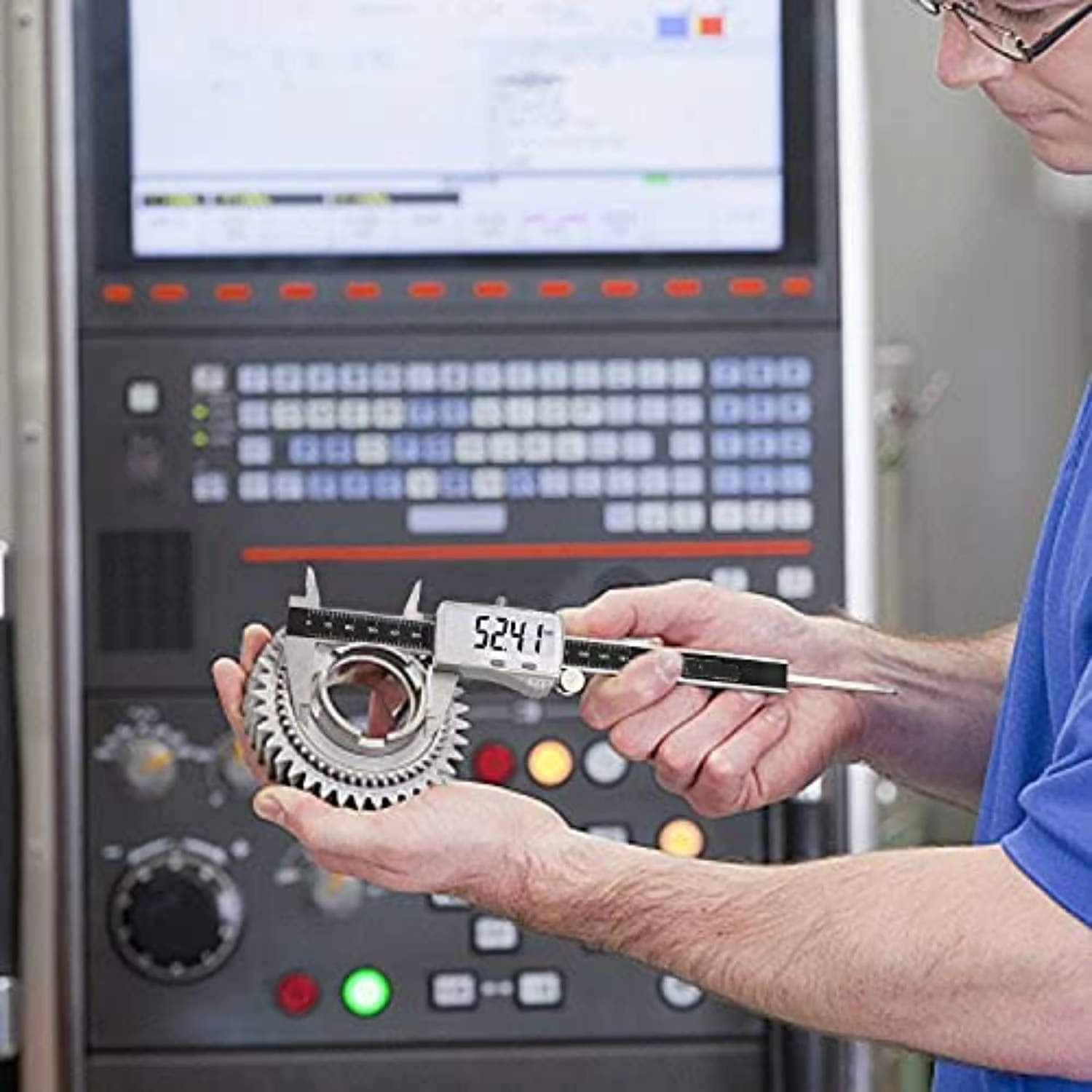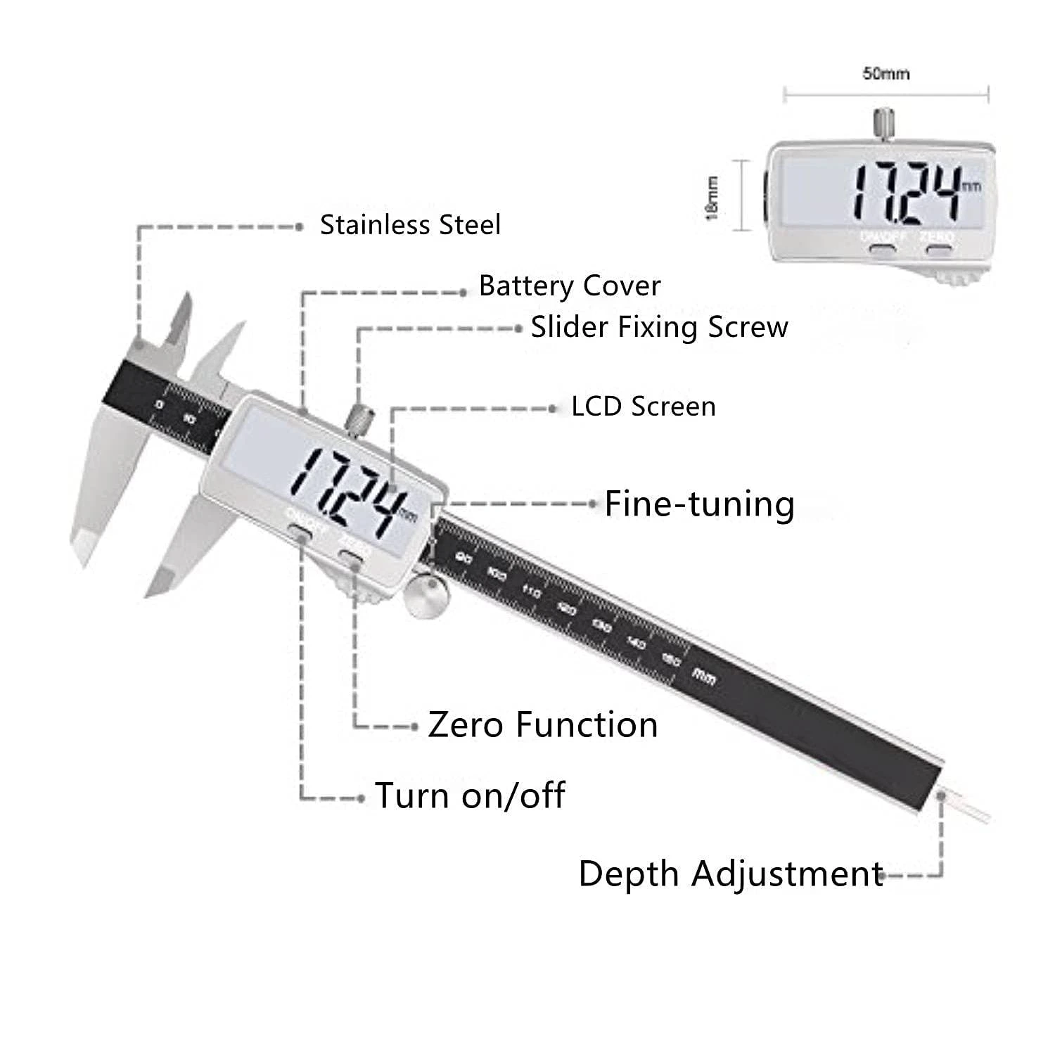 Edelstahl und robust Der robuste Messschieber aus Edelstahl kann die Lebensdauer verlängern, und der numerische Wert kann durch Ausrichten des Feststellknopfes und Festziehen leicht fixiert werden.