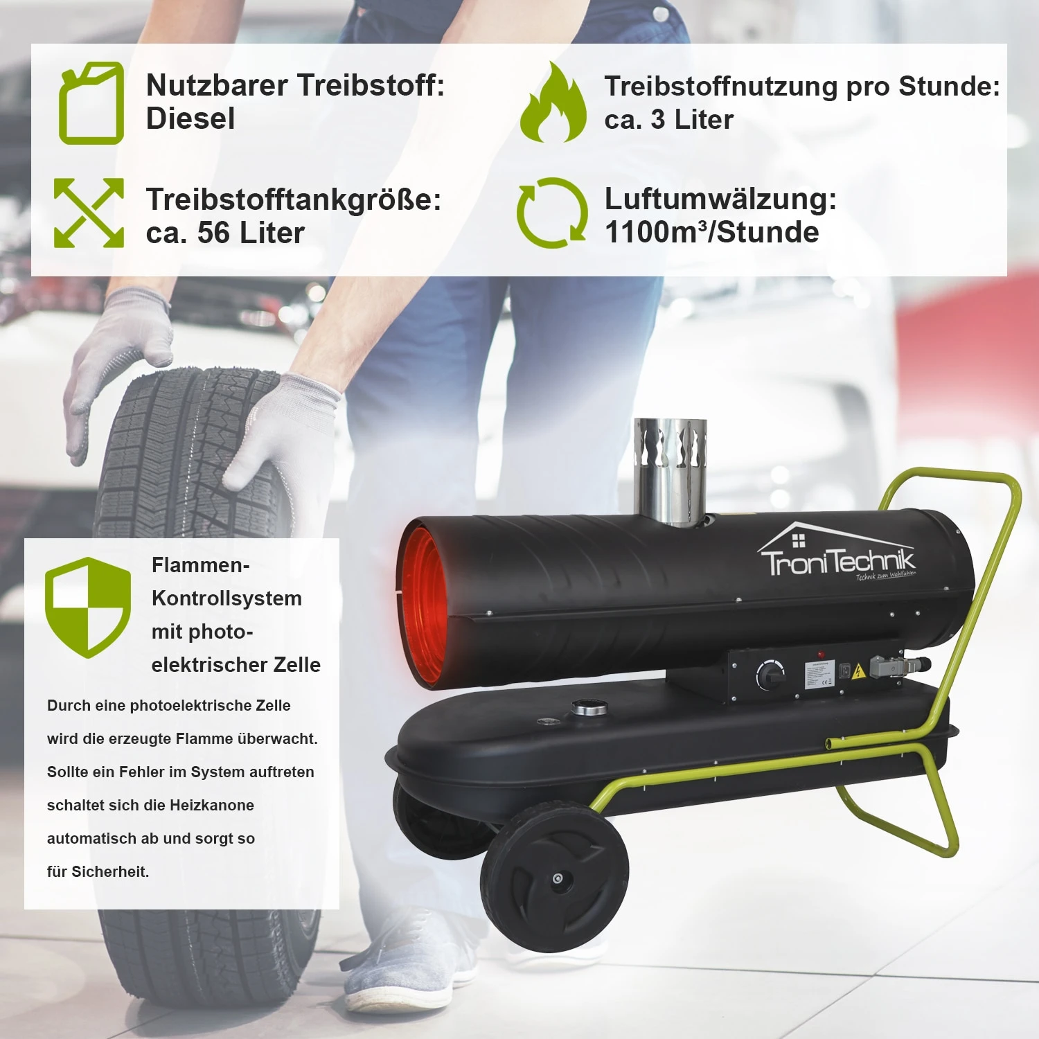 Hinweis: Dieselbetriebene Heizkanonen sind zum Heizen und Trocknen in gut belüfteten Innenräumen, z. B.: Rohbauten, oder in Außenbereichen geeignet.