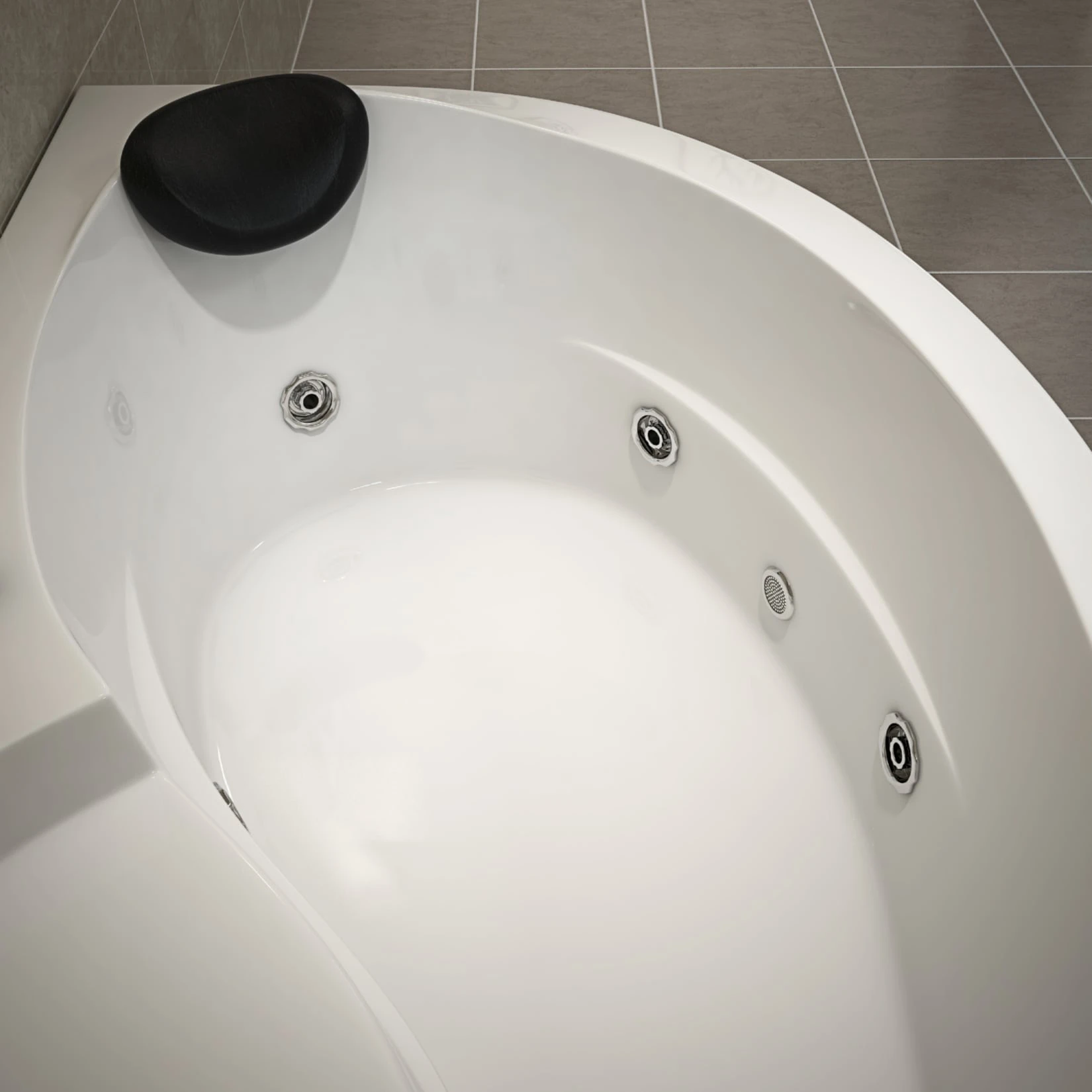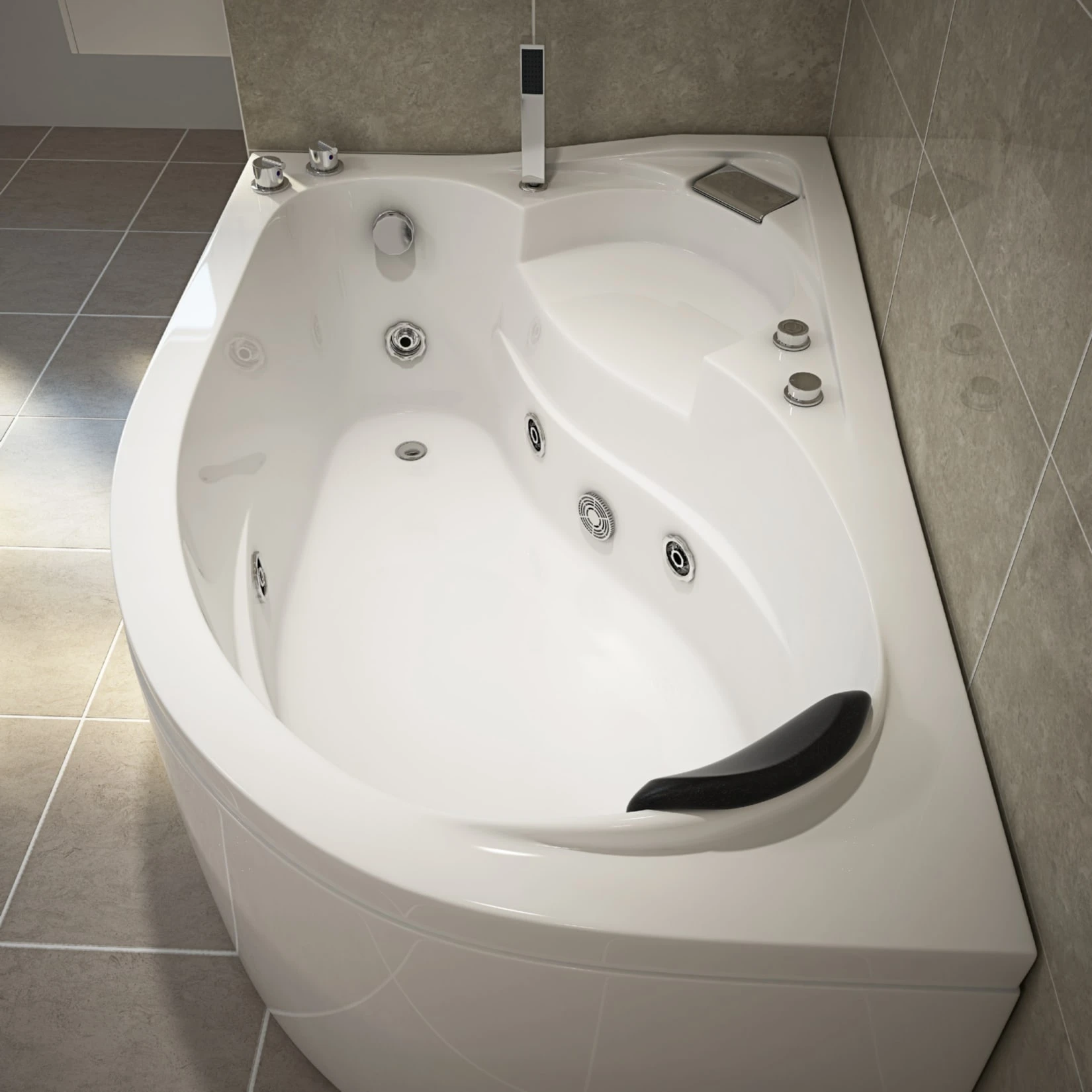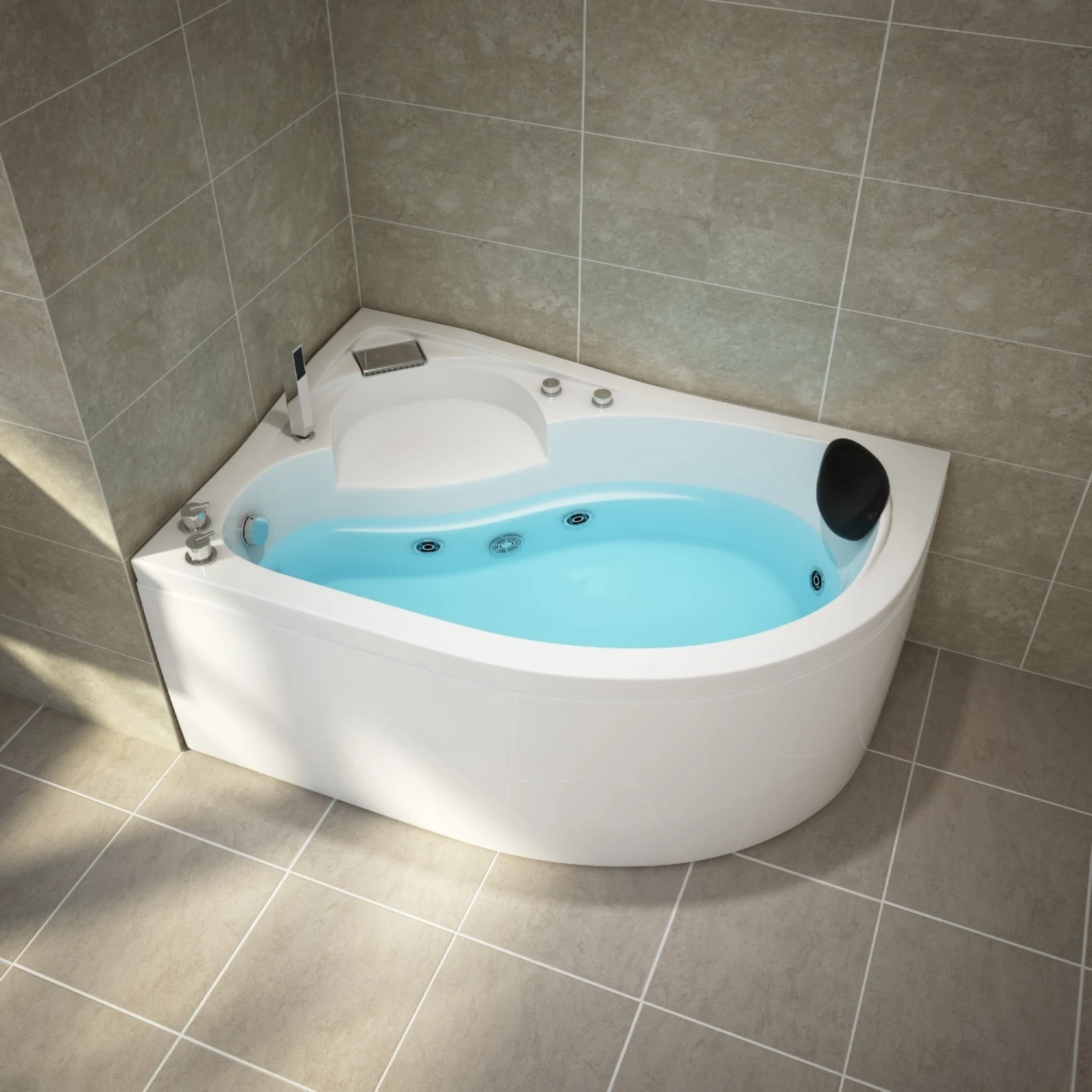 Dieser Whirlpool ist für die Eckmontage ausgelegt und passt dank seiner Maße in nahezu jedes Badezimmer.
