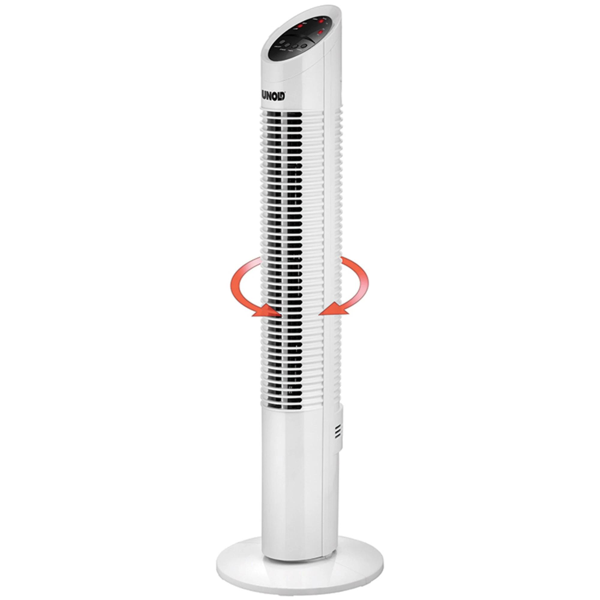 In coolem Weiß setzt der Turmventilator Tower Akzente im modernen Wohnambiente. Per Knopfdruck wird die dreistufige Geschwindigkeitsregelung aktiviert, was auch ganz bequem mit der mitgelieferten Fernsteuerung möglich ist. Zur besseren Luftverteilung im Raum lässt sich die 70°-Oszillation zuschalten. Außerdem kann der Turmventilator Tower durch die Timer-Funktion von 0,5 bis 7,5 Stunden vorprogrammiert werden. Bedienerfreundlich und quasi selbsterklärend, mit stabilem Standfuß und praktischem Tragegriff im Gehäuse ausgestattet.