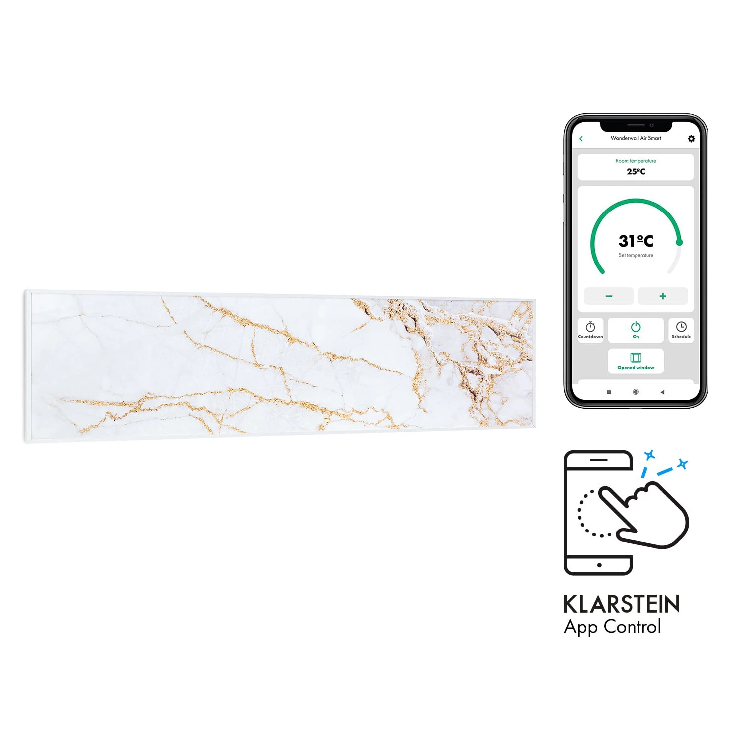 Klarstein Wonderwall Air Art Smart Infrarotheizung Elektroheizung Heizpanel | 120 x 30 cm | 350 W | 7 m² | App-Steuerung | geräuschlos | Wandaufhängung | OpenWindow Detection | für Allergiker | Thermostat | Wochentimer | IP44 | Design: Marmor II