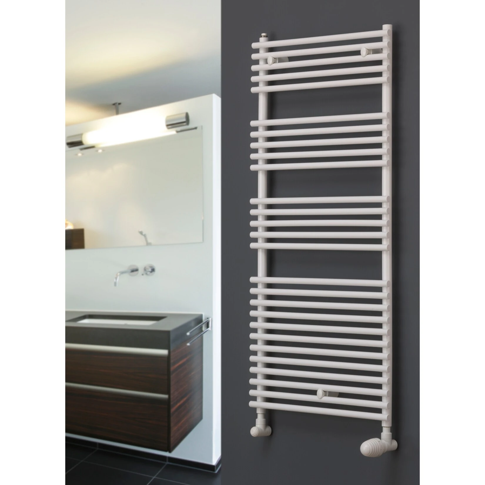 XIMAX Badheizkörper TEC in gerader Ausführung mit aufgesetzten Rundrohren und Standardanschluss.